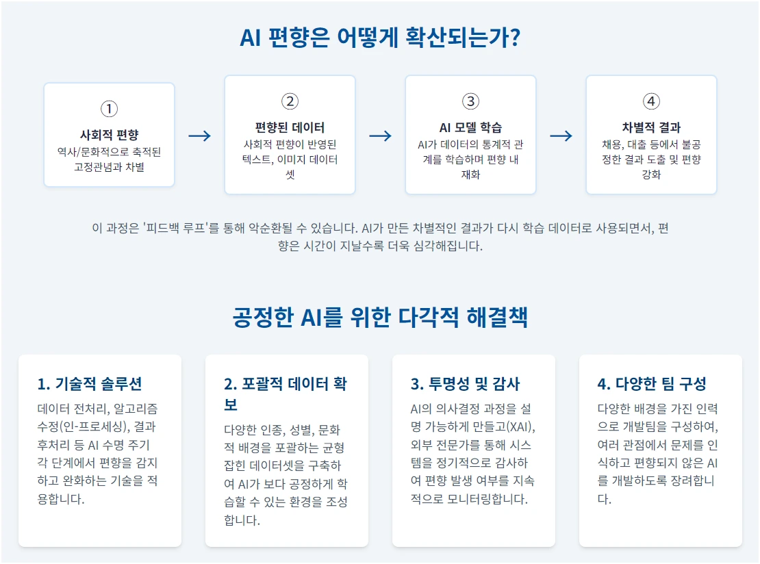 AI 시스템의 투명성을 높이고 정기적으로 감사하여 편향을 확인하고 수정하는 과정이 필요함.