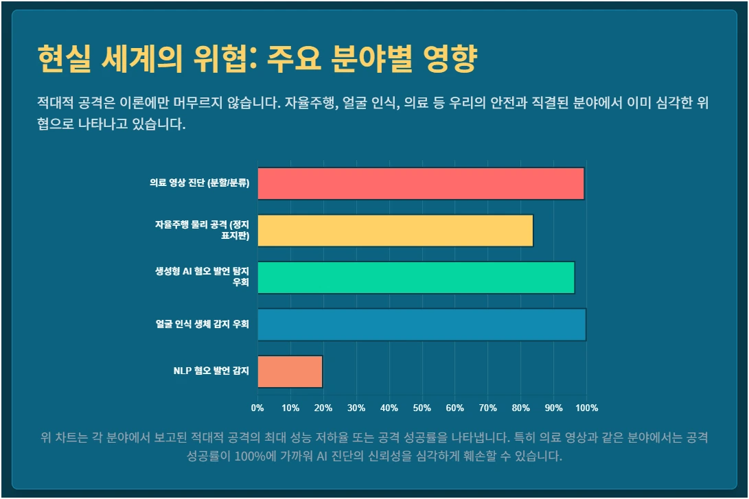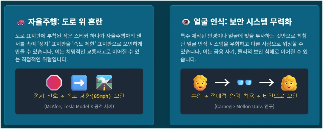왜 이 사례가 중요한가?: 이 사례는 AI 시스템이 어떻게 인간의 눈에는 보이지 않는 미세한 변화에 속을 수 있는지를 보여줍니다. 자율주행차와 같은 안전-critical 시스템에서 이러한 취약점은 심각한 사고로 이어질 수 있습니다.