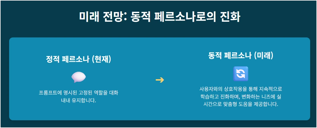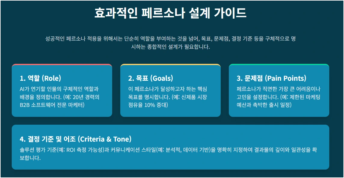 출력 기대: 설정한 페르소나에 따라 기대되는 답변의 형식과 내용이 달라집니다. 각 역할에 맞는 관점에서의 답변을 유도합니다.