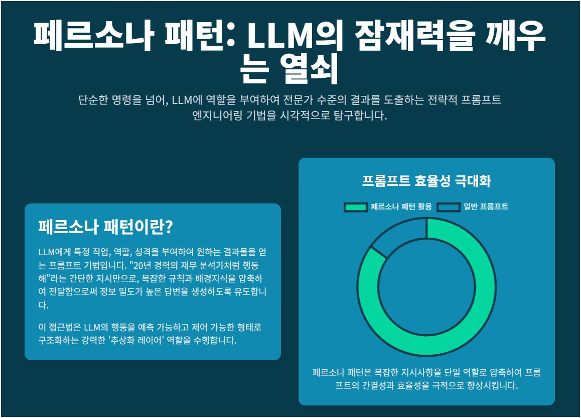 정보 밀도: 페르소나 패턴은 간결한 요청으로 복잡한 정보를 효과적으로 얻을 수 있게 해 줍니다. 많은 정보를 짧은 형식으로 요청할 수 있습니다.