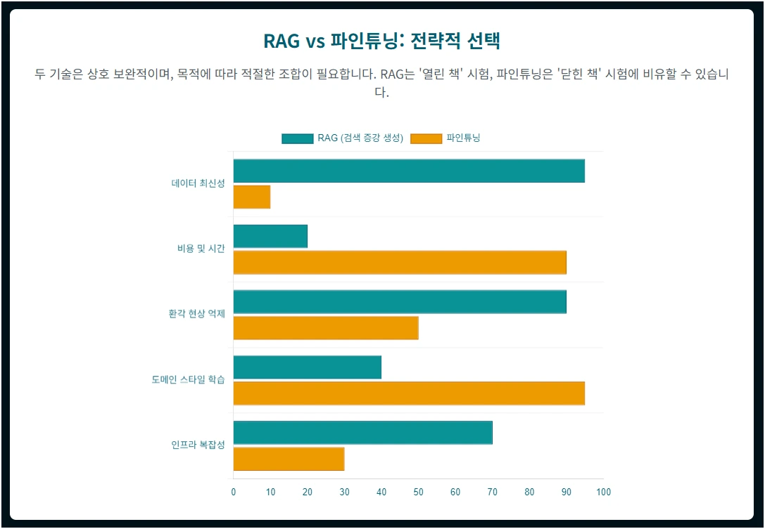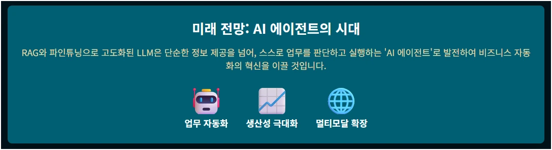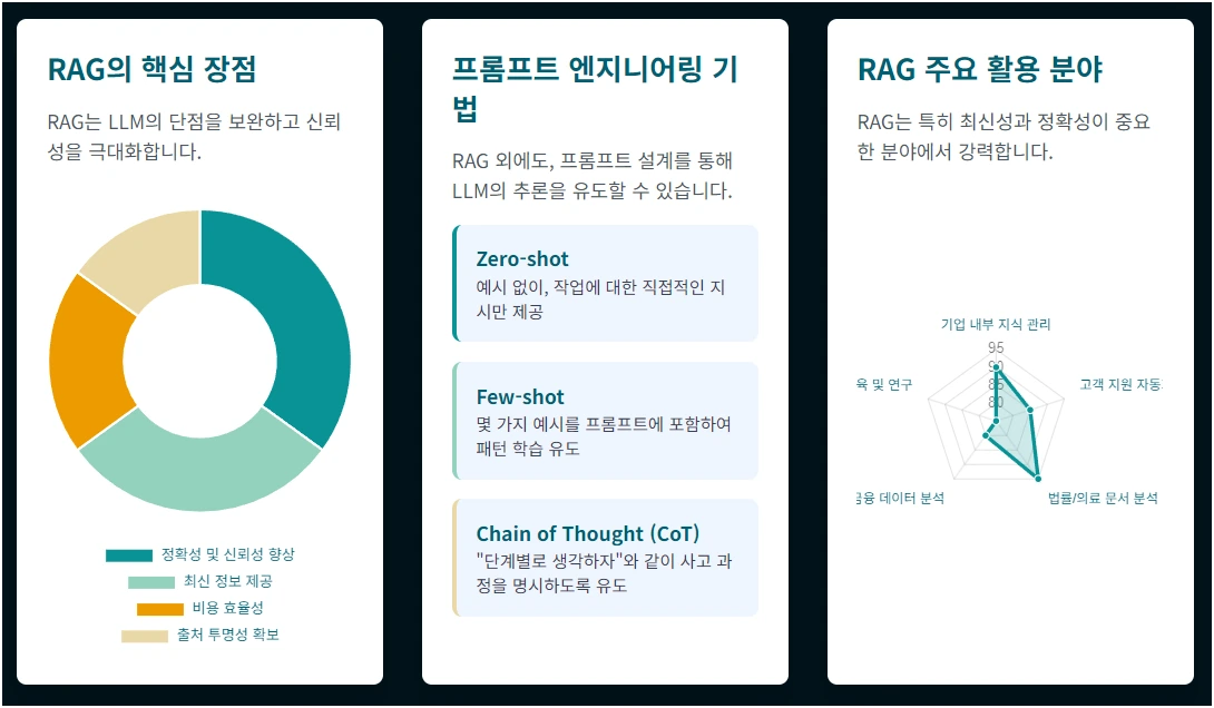 핵심 원리: LLM의 재학습이 아닌, 프롬프트라는 '입력 창'을 통해 새로운 정보를 주입하는 방식입니다. 이 방식은 검색 엔진과 결합하여, 검색 결과로 얻은 문서를 프롬프트에 넣어 LLM이 해당 문서를 기반으로 질문에 답하도록 하는 미래의 애플리케이션 개발에 중요하게 활용될 것입니다.