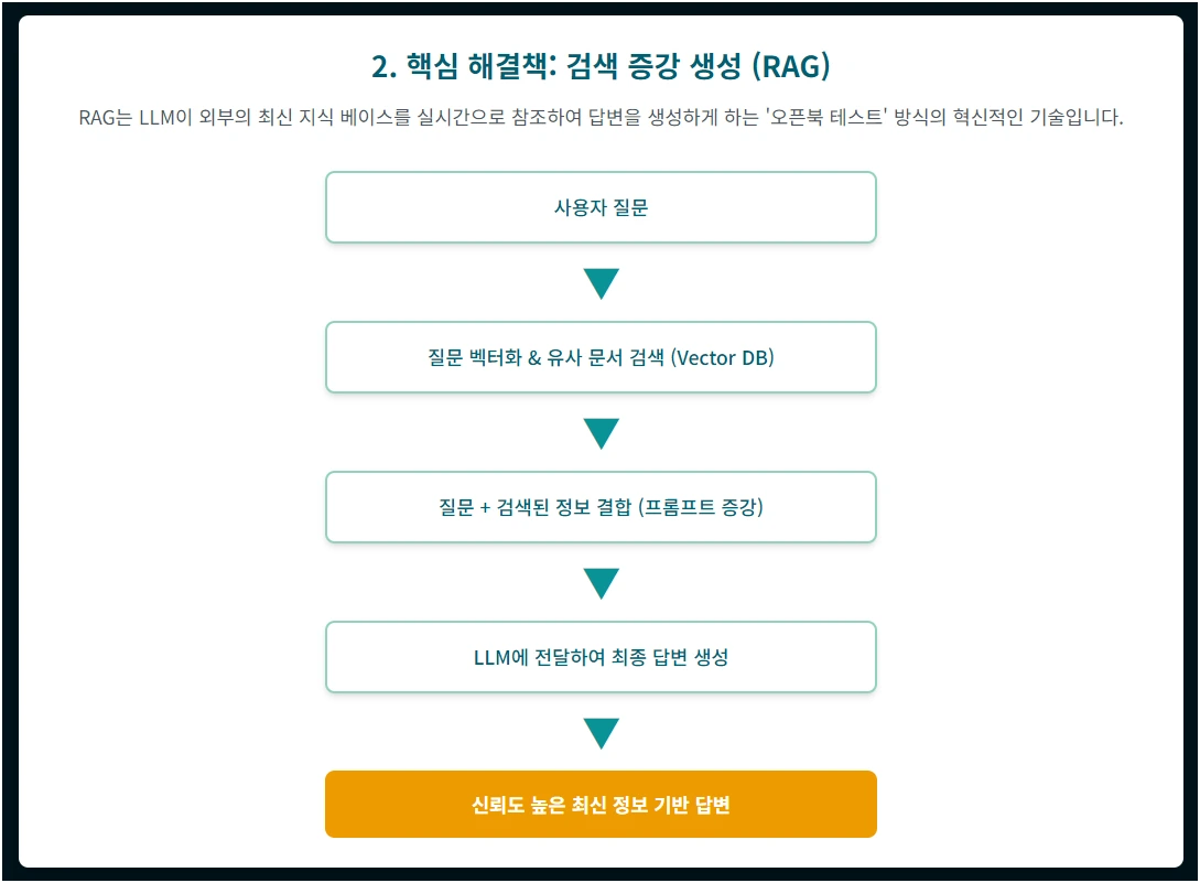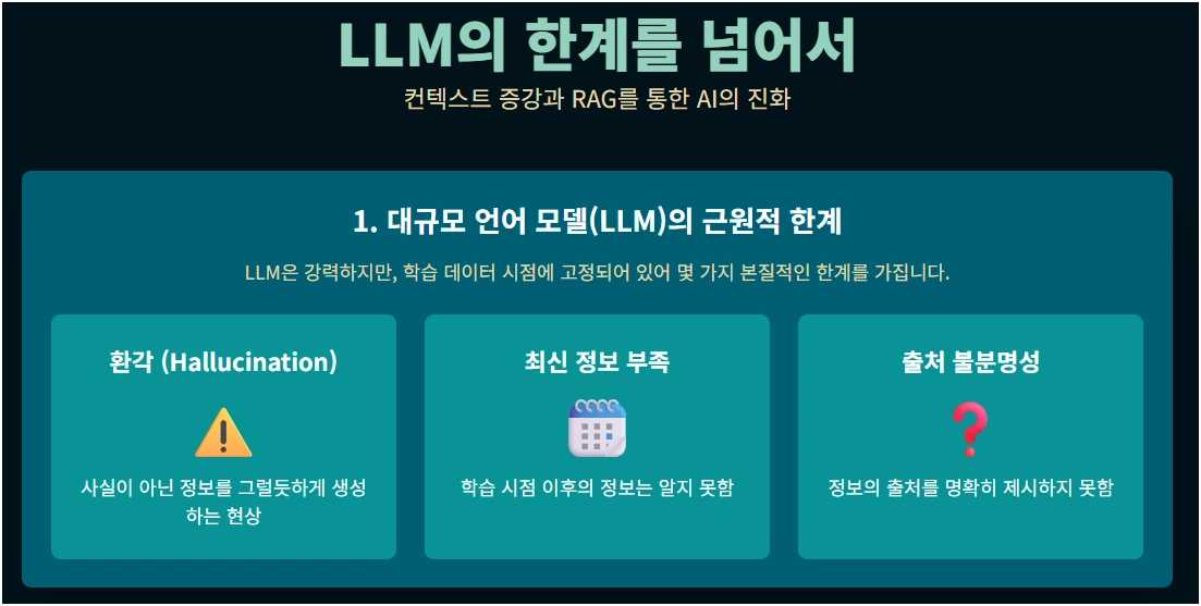 LLM은 특정 시점 이후의 최신 정보나 훈련 데이터에 없는 개인화된 정보(예: 특정 기업의 내부 문서, 개인 데이터)에 접근할 수 없습니다. 이러한 한계를 극복하기 위해 프롬프트에 필요한 정보를 직접 제공하는 것이 핵심입니다.
