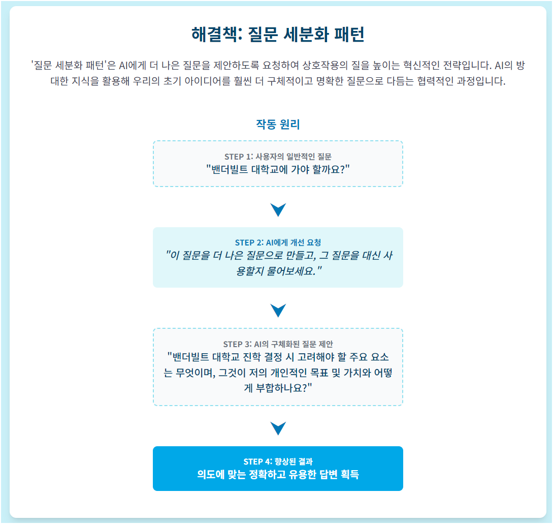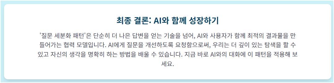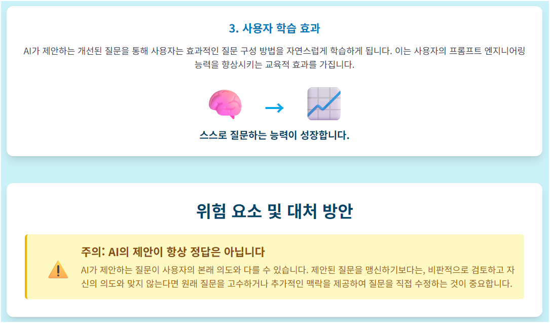 자기 반성 촉진: 질문을 개선하는 과정에서 자신의 생각과 가정을 재검토하게 됩니다. 이는 더 깊이 있는 사고를 유도하고, 더 나은 결정을 내리는 데 도움을 줍니다.