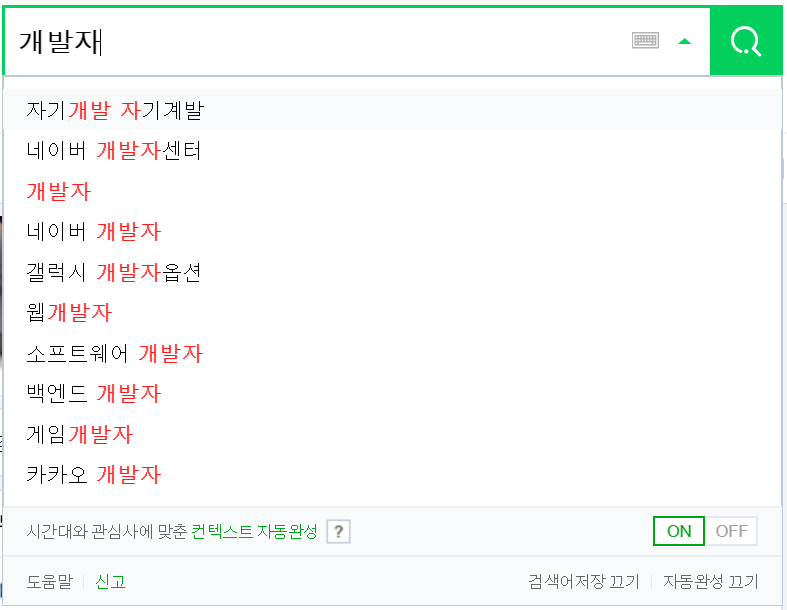 1)좌측과 같이, 네이버 검색창에 [개발자]라고 하는 키워드를 처보기만 해도, 웹개발자, 소프트웨어개발자, 백엔드개발자, 게임개발자와 같이 사람들이 [개발자]가 되기 위해 많이 검색하는 키워드 등을 확인할 수 있다.