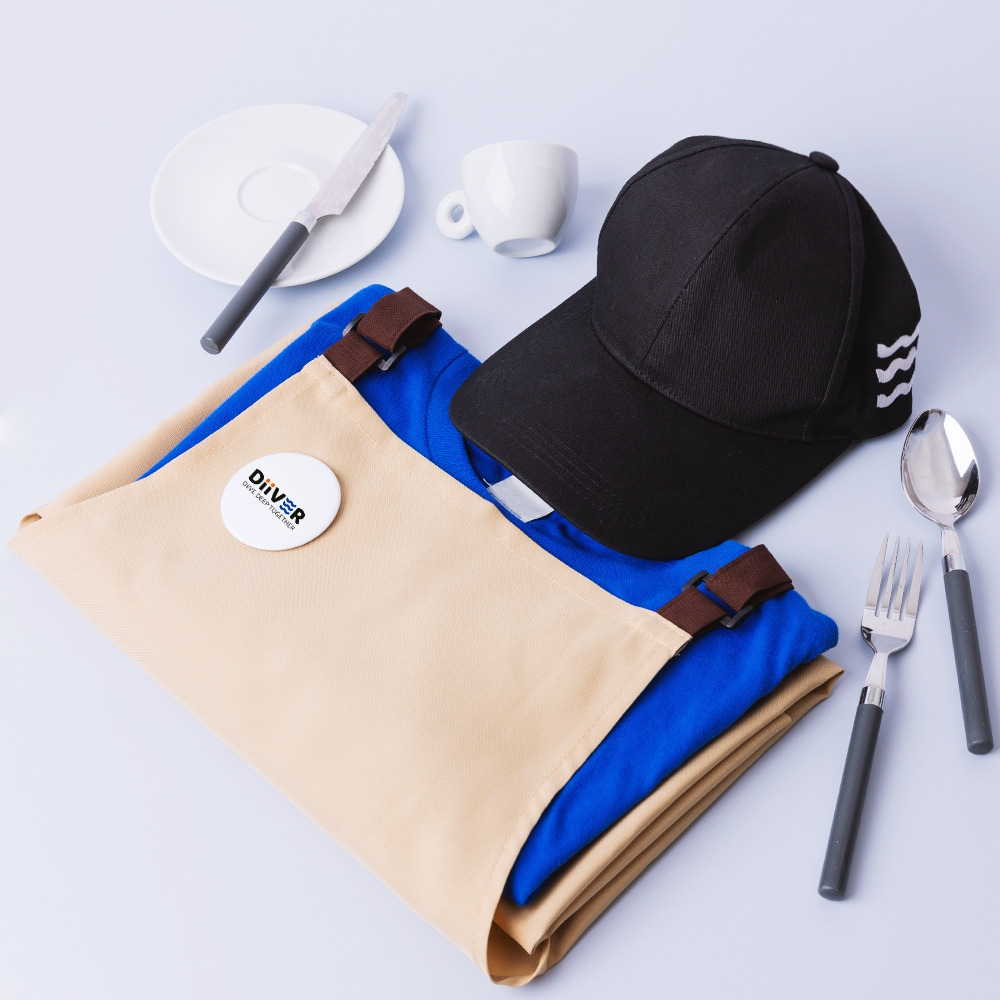 "이어서 식당, 카페 구분 없이 많이 볼 수 있는 굿즈로는 앞치마와 모자가 있습니다. 앞치마는 포켓이 부착되어 있기 때문에 개인 복장에 관계없이 근무자의 편리함을 상승시켜 주죠. 요식업 종사자라면 오염은 불가피하기 때문에 넉넉한 사이즈의 앞치마를 착용한다면 청결한 인상을 주고 적극적인 움직임이 가능해집니다. 아, 브랜딩을 위해 프린팅도 좋지만 로고 핀버튼(뱃지)도 추천해 드리고 싶어요. 좀 더 트렌디하고 키치하게 브랜드의 아이덴티티를 강화할 수 있거든요."