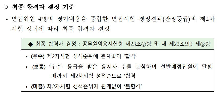 따라서 인사혁신처에서도 공지하고 있듯, 사실상 3차에서 '우수'나 '미흡'을 받지 않은 이상, 이미 2차 합격자가 발표된 순간부터 운명은 정해진 것이라고 볼 수 있겠습니다.