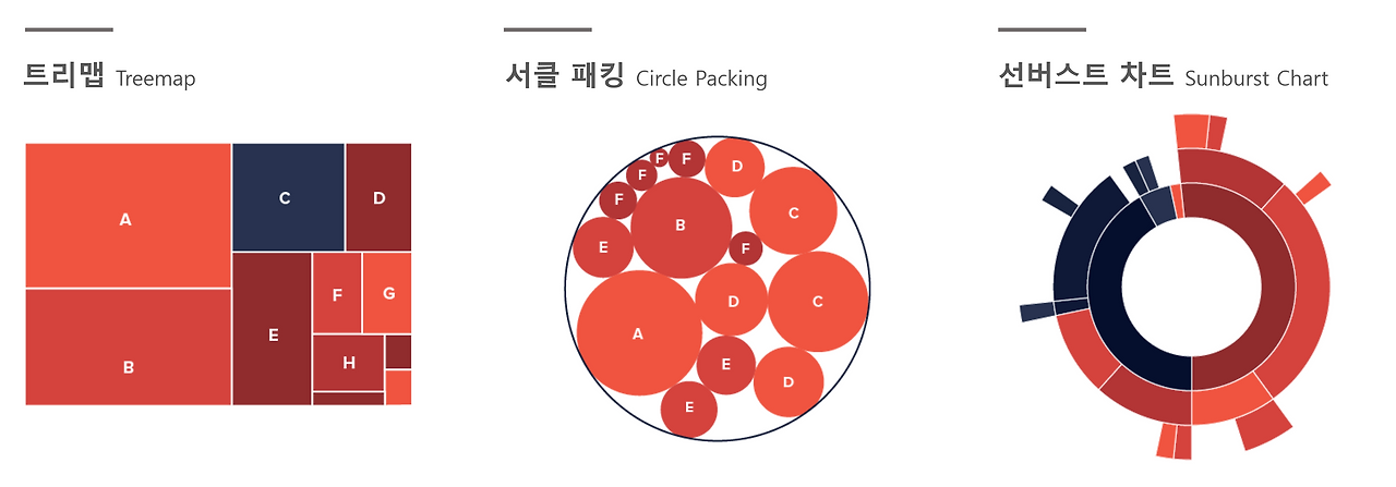계층형 트리맵(tree map), 써클 패킹(Circle Packing), 선버스트 차트(Sunburst Chart) 등을 예로 들 수 있습니다. 시각화 사례를 바탕으로 계층형 시각화에 대한 이해를 더 해볼까요?