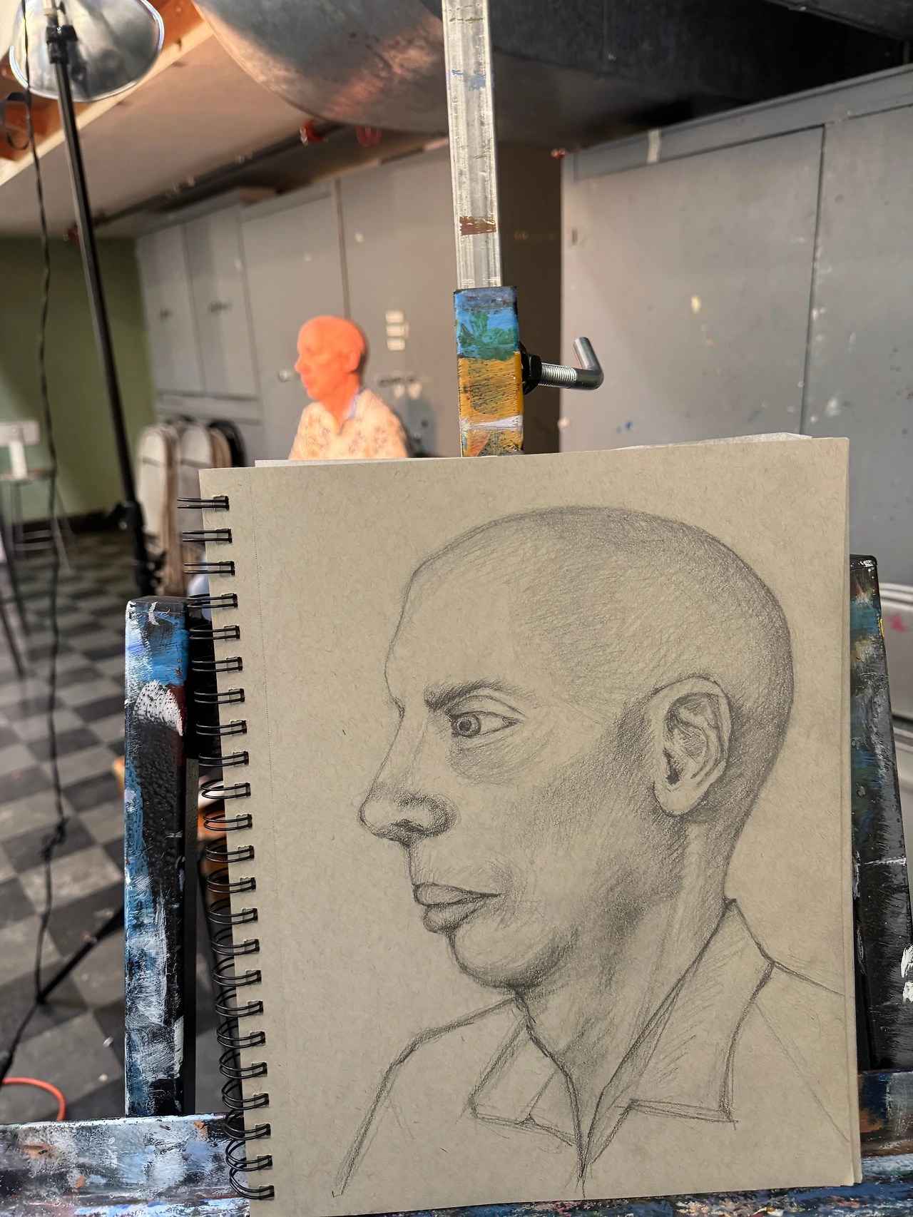 그림을 그리며 느꼈다. 복잡한 헤어스타일과 안경을 포함한 장신구들이 추가되면 그림 난이도가 얼마나 높아지는 것이었는지를. 이 분은 내가 조각상 드로잉을 마치고 첫 모델 수업 때 뵈었어야 했었다! 왜 선생님께서 인물화를 집에서 더 연습하고 싶다면 두개골 모형을 여러 각도에서 그려보라고 말씀하셨었는지 이해할 수 있었다. 머리카락이 없으니 머리와 목이 연결되는 부분의 근육들, 두개골의 곡선들, 움푹 들어간 관자놀이, 귀가 붙어있는 각도까지 꼼꼼하고 명확하게 관찰할 수 있었다. 각 부분들이 연결되는 모습이 명확하게 보이니 얼굴의 선들과 명암들이 논리적으로 보였다. 이렇게 ‘기승전결’이 명확할 수가!!! 복잡한 부분들이 가려져 있다고 그리기 쉬운 것이 아니었다. 안 보이는 부분을 유추하여 다음 단계를 채워 넣는 것은 원래 기본을 넘어서는 것이었다. 그런 의미에서 오늘 뵌 모델분은 오늘 나를 구원해 주러 오신 것이 분명했다.
