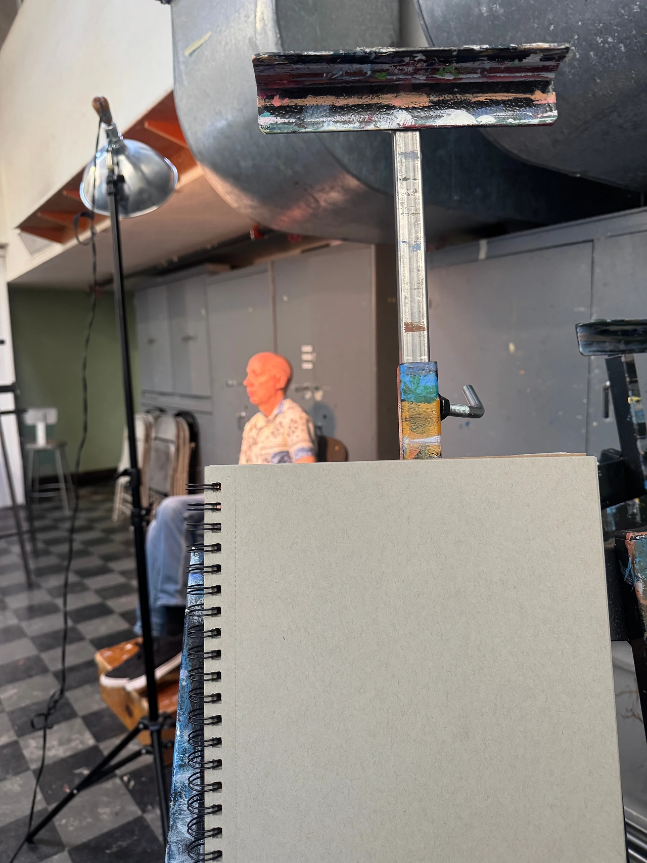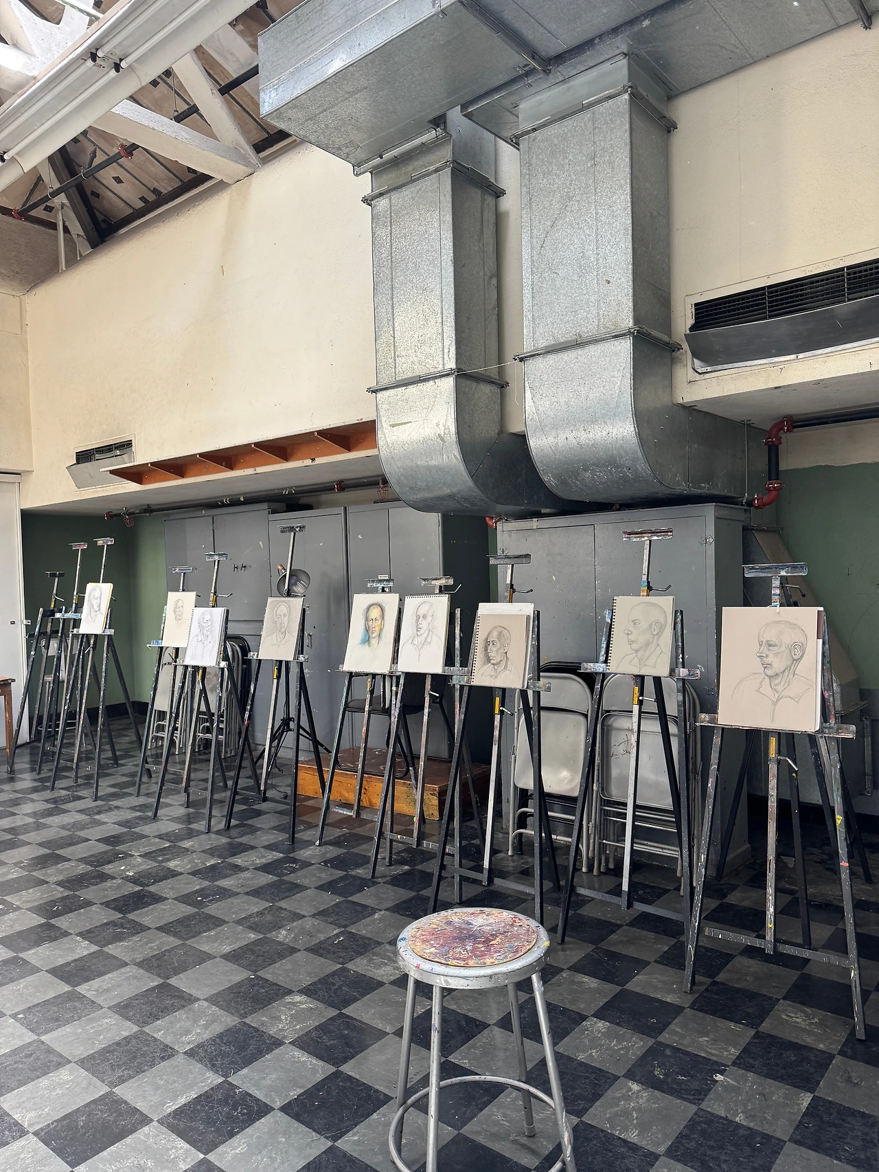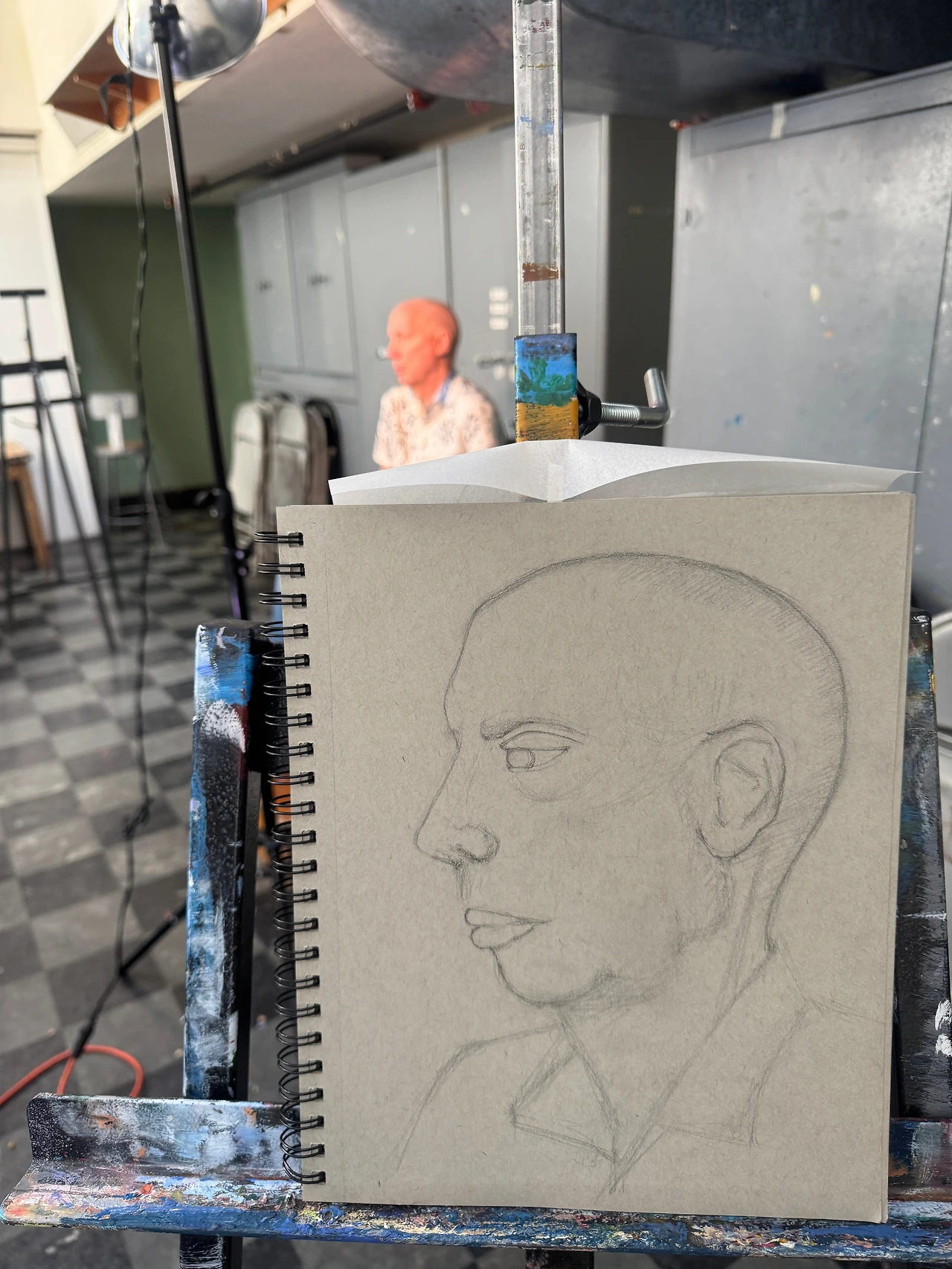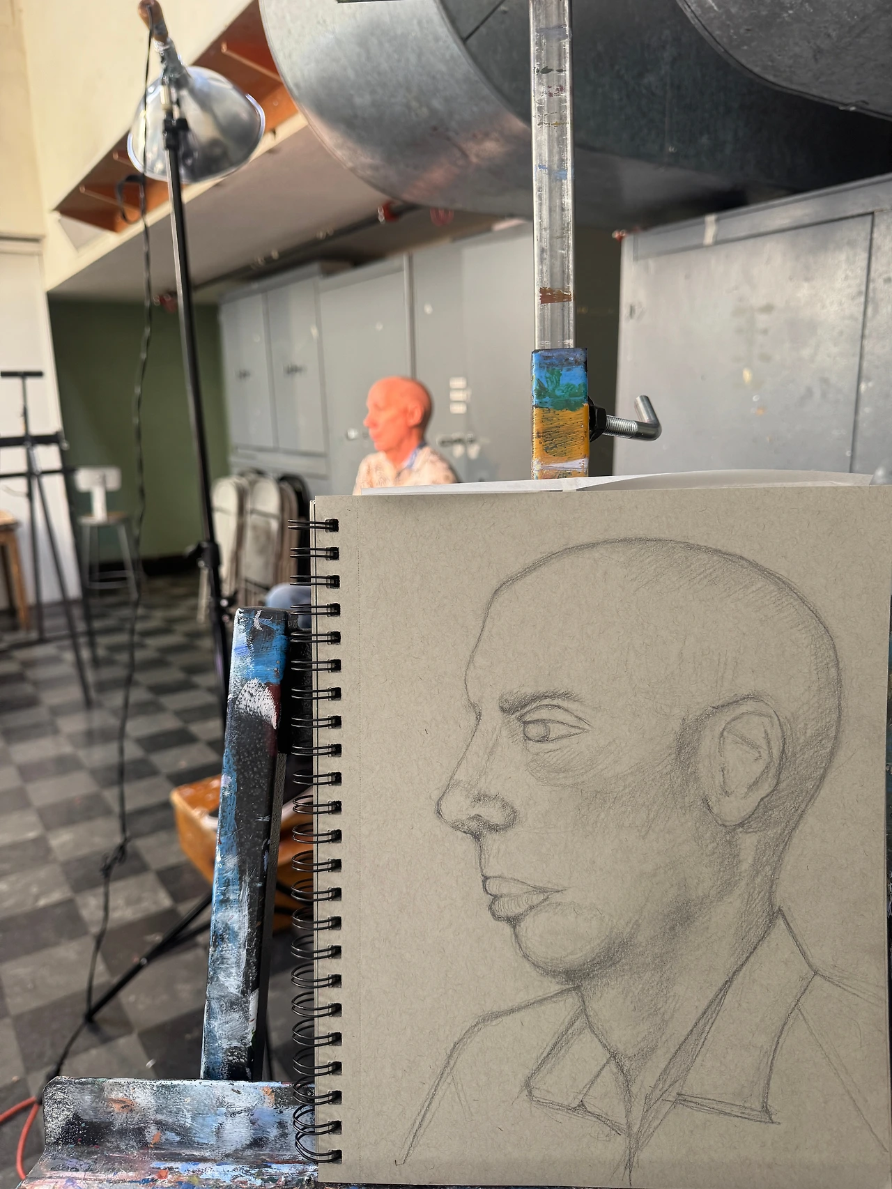 그래서 오늘은 ’ 기본‘으로 돌아가기로 했다. 재료도, 방법도, 구도도, 내 마음가짐도… 이런 생각으로 스튜디오에 들어갔더니 내가 가진 오늘의 목표에 아주 잘 부합하시는 모델분이 계셨다. 안경도 안 쓰셨고, 장신구도 없으셨고, 수염, 머리카락도 없으신 남자분이셨다. 이론으로 배웠던 얼굴의 비율을 바탕으로 도화지에 차근차근 옮겨내는 것에만 집중하는데 아주 적합한 모델분이었다. 내가 가진 4B와 6B 연필, 블랙과 화이트 차콜 펜슬, 콩테 펜슬 중에서 4B 연필을 일단 골랐다. 요행 없이 -기본 재료로, 비율을 정확하게 측정해서, 명함을 섬세하게 넣어서- 성실하게 오늘의 그림을 그려내고 싶었다.