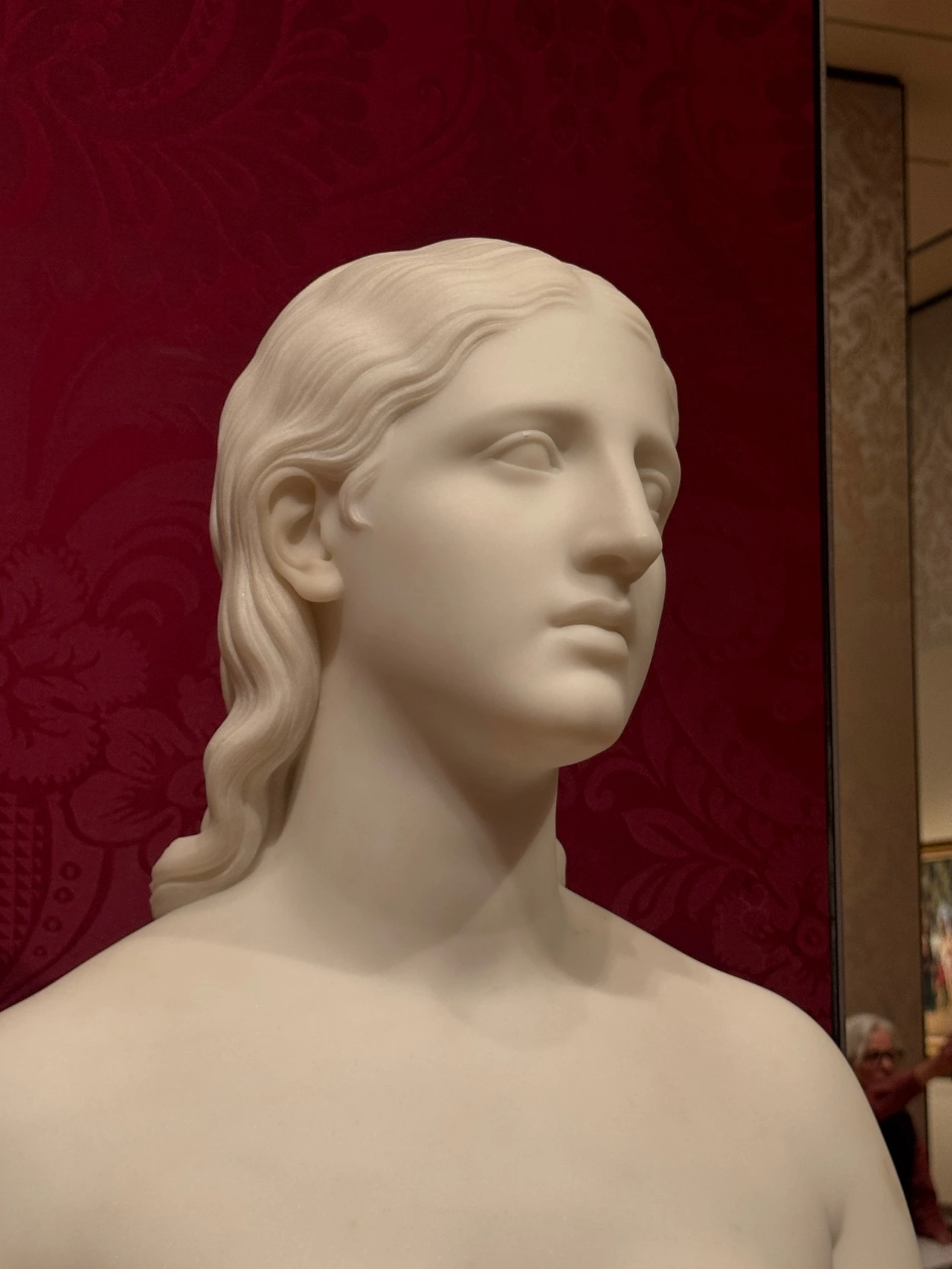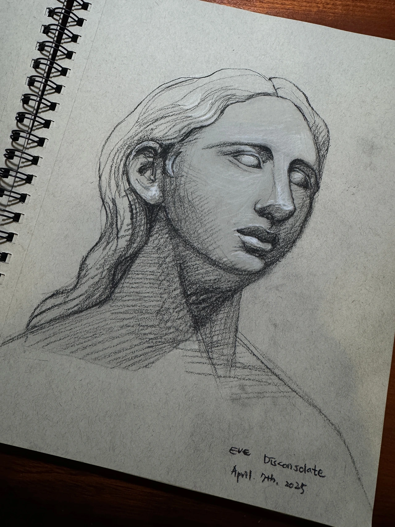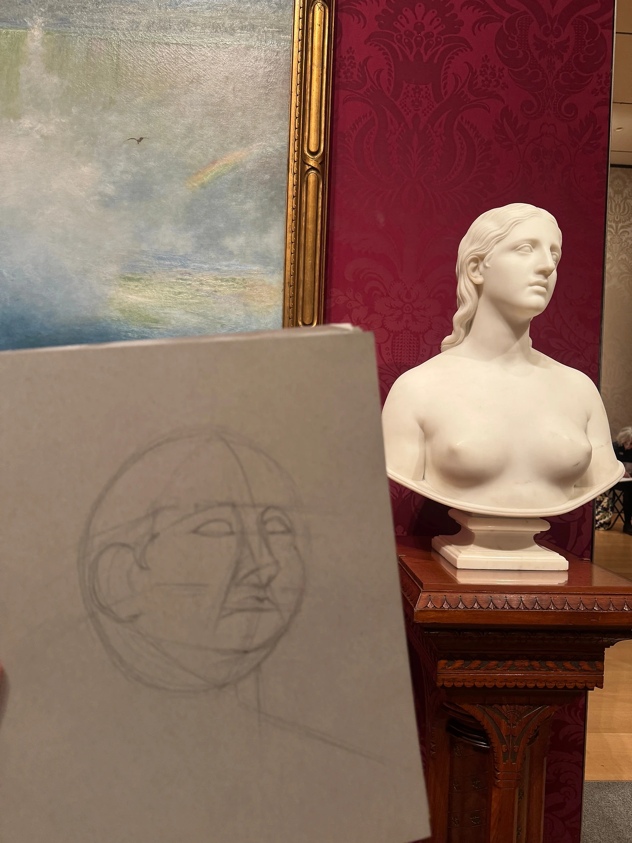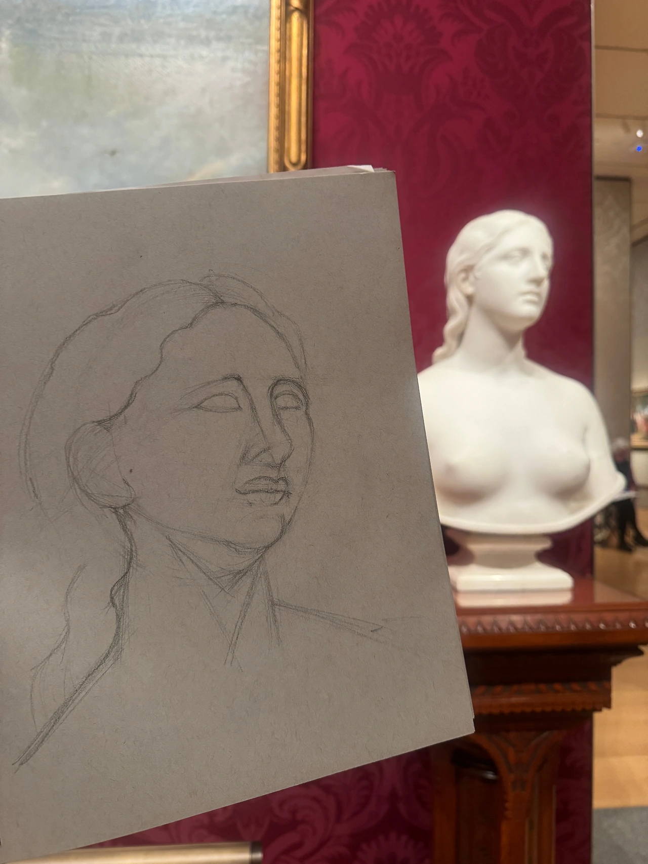오늘은 선생님께서 얼굴 골격, 안면 근육의 분포 등이 인쇄된 자료를 나눠주셨다. 물론, 나눠주기만 하고 ‘이 근육은 이렇고 광대가 이러니 요렇게 그려야 해’라는 식의 기대했던 자세한 설명은 없었다. 취미수업이라 그럴 수도 있겠지만, 미국 스타일이 대체로 이론이나 설명을 장황하게 늘어놓기보다는 항상 ‘일단 해봐라’라는 것이 일반적이다. 자료에 대한 간략한 설명을 듣고 Gallery로 내려갔다. 겨우 구구단까지 배웠는데 바로 이차함수 문제를 받은 기분이랄까… 일단, 받은 문제는 풀어내야 하니 오늘 나의 희생양이 될 masterpiece를 골라야 했다. 정말 여신같이 단아하고 우아한 조각상이 눈에 들어왔다. 모든 미인이 그렇듯 군더더기 없이 완벽한 조화를 가진 얼굴이 너무나도 아름다웠다. 그저 정직하게 내 스케치북으로만 옮긴다면 크게 어려울 것이 없어 보였다. 심지어 정면은 너무 쉽게 그려질 것 같아서 살짝 옆얼굴이 보이는 쪽으로 의자를 펴고 자리를 잡았다. …그리고 십여분이나 지났을까, 오늘도 큰 착각을 했다는 사실을 깨닫게 되었다.