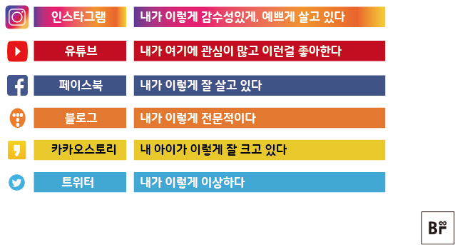 예를 들면 가장 좋은 예가 '인스타'다. 그리고 사람들은 주로 자기의 가장 잘난 모습, 행복한 상황에 대해 포스팅하기를 좋아한다. (비록 그게 일생의 10%도 안되는 일부이고 90%는 힘들게 일하는 모습, 짜증났던 일들로 채워져 있는데도 그런 거 따위 올리기 좋아하는 사람이 있을리 만무하고 보는 사람도 그리 마음이 편치 않을지도 모를 일이다. 그치만 가끔 이런 진실된 포스팅이 사람들의 공감을 더 얻어낸다는 건 이런 '내가젤잘나가' 대잔치에 지쳐 가고 오히려 진심 어린 것들에 대한 갈망을 역설적으로 보여주는 것일지도 모르겠다.