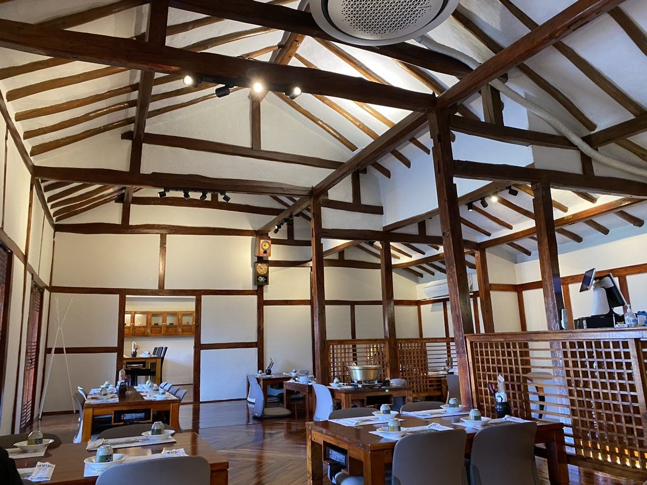 신발을 벗고 식당 안으로 드니, 마룻바닥은 근대식 목재 바닥이었고 서까래는 꽤나 전통적인 스타일을 잘 유지하고 있었다. 아침부터 영업 세팅을 깔끔하게 마치고 경쾌한 fm 음악이 흘러나오고 있었다.