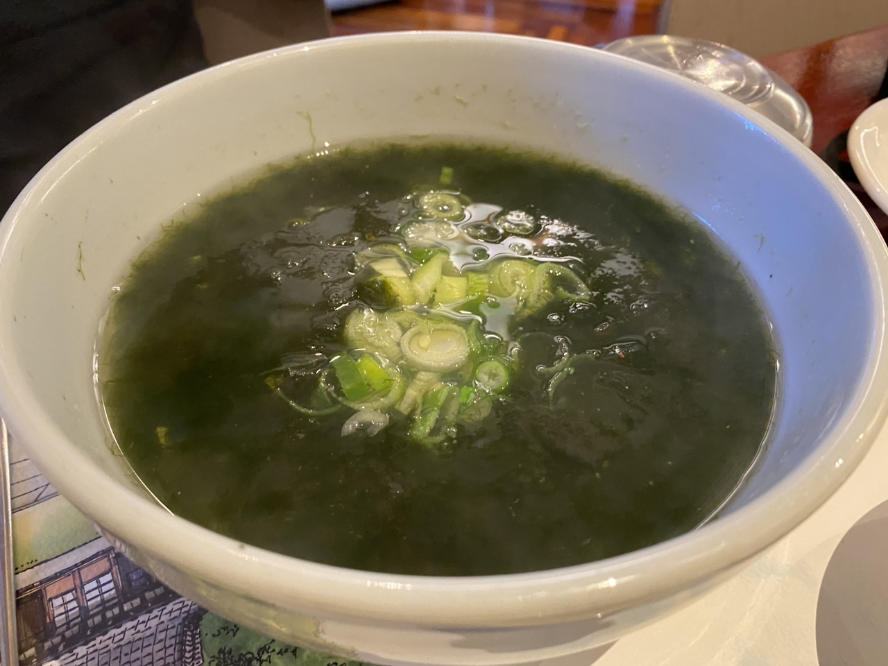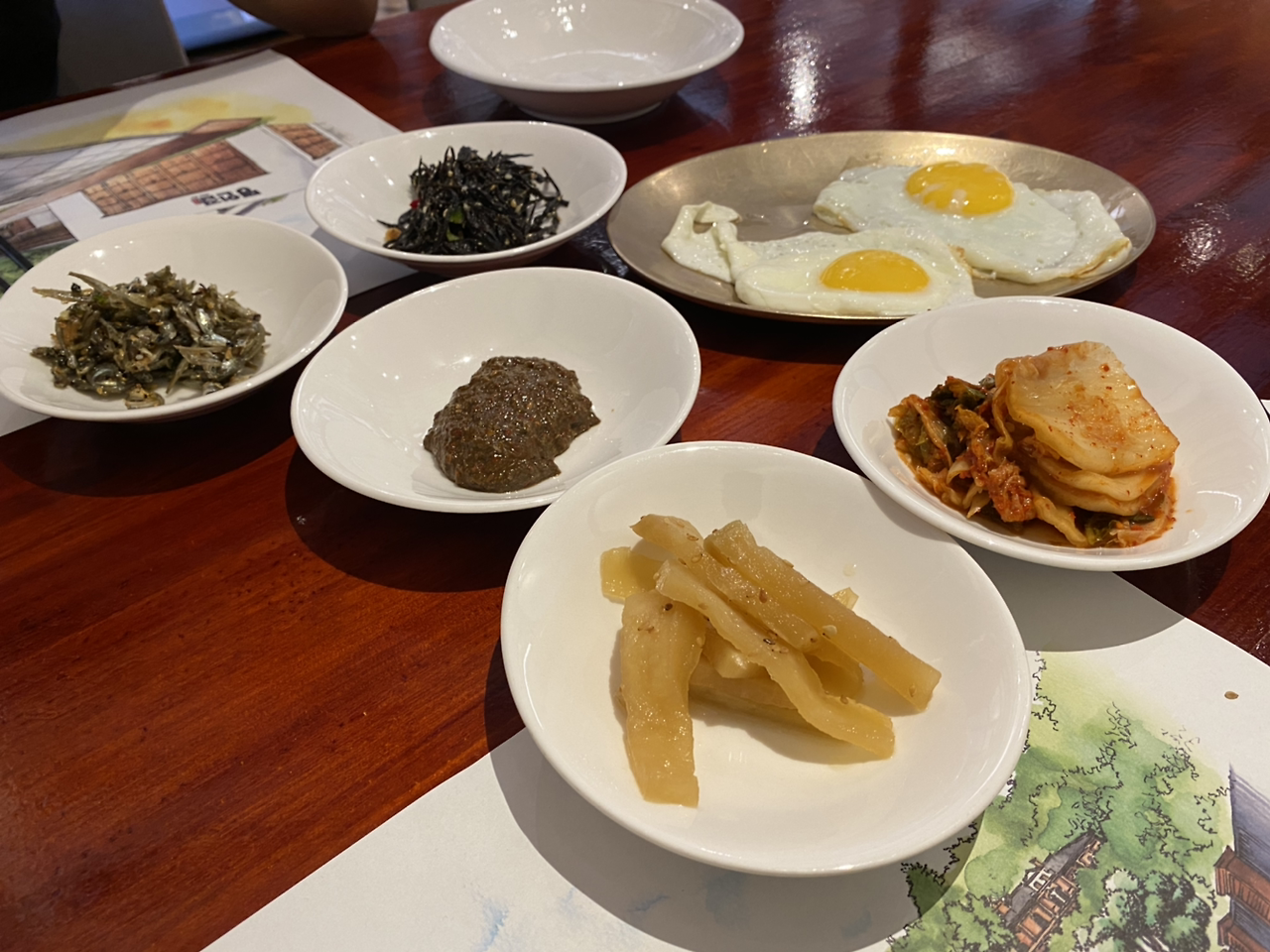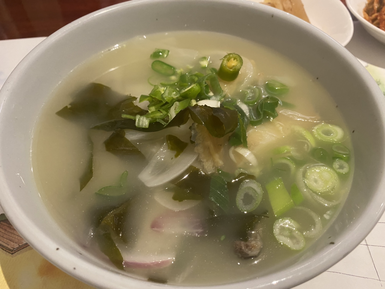 조식 메뉴가 따로 있었는데, 우런간국(간국이란 '간이 된 국'을 뜻한다고 함), 가시리된장국, 홍오애국('애'는 내장의 전라도 방언 정도 되는 것 같음), 조기조림이 있었는데 죄다 생소한 메뉴들이어서 나는 그 중에 첫 메뉴로 나와 있는 우럭간국을 그리고 친구는 메생이국을 골랐고 거기에 코다리를 하나 추가했다.