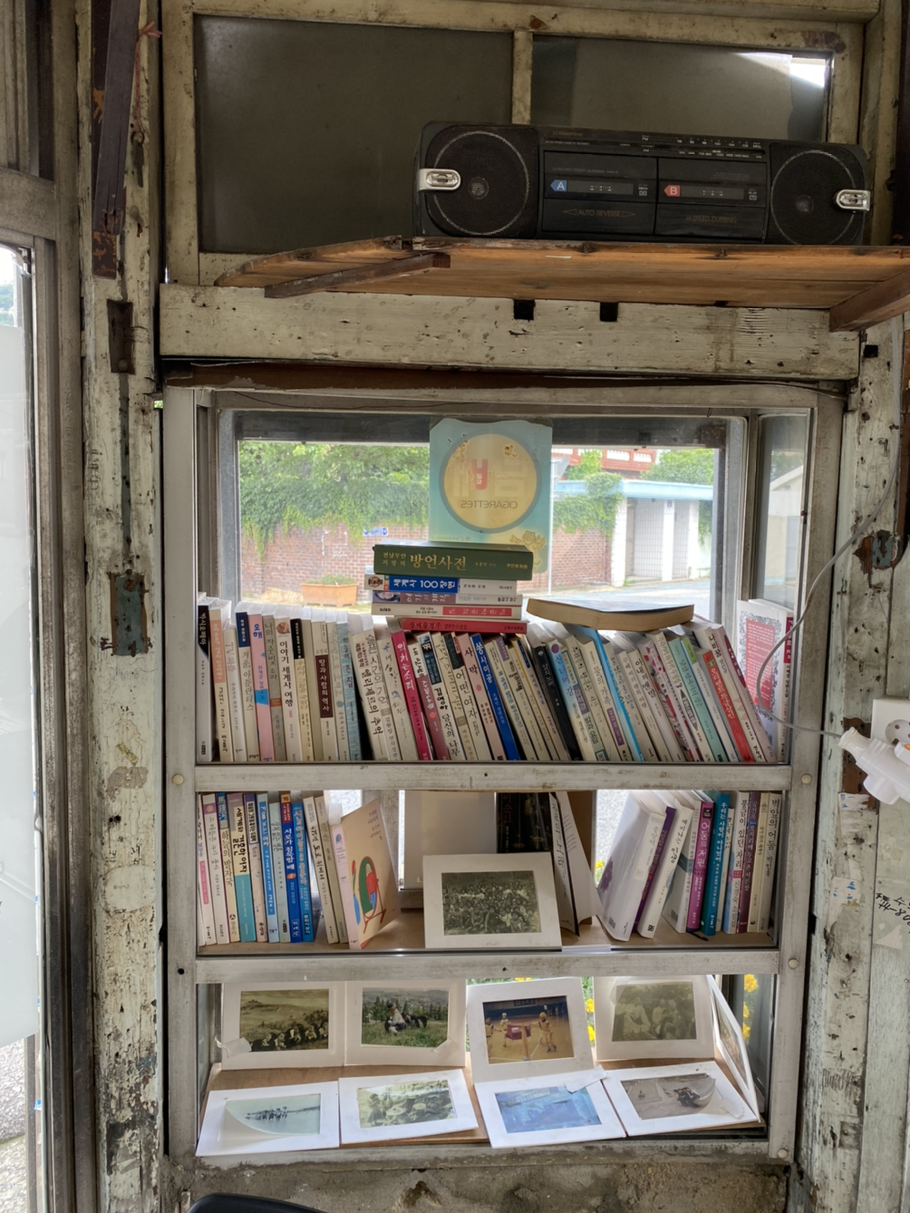 세월의 떼가 묻혀진 하얀 나무틀과 그 위로 주인을 잃은 먼지 쌓인 책들이 어지럽게 꽂혀 있다. 더 이상 노래가 흘러나오지 않는 라디오도 분위기를 맞춰보려는 듯 한 자리를 차지하고 있었다.
