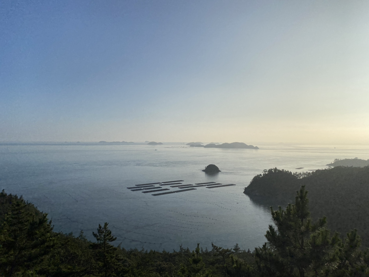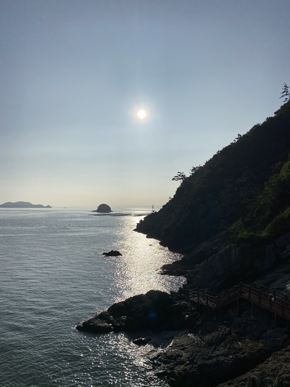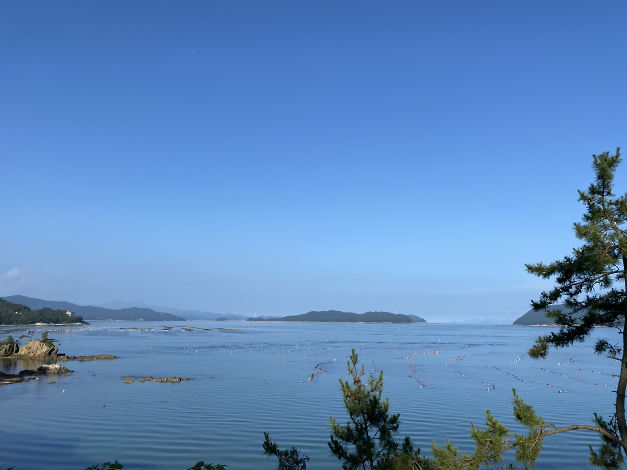 그래도 구름 한 점 없는 하늘과 바다의 경계를 나누는 건 띄엄띄엄 보이는 섬들 뿐이었다. 울창한 나무 숲 사이로 보이는 경치가 여름 산길의 시원한 활력제가 되었다.
