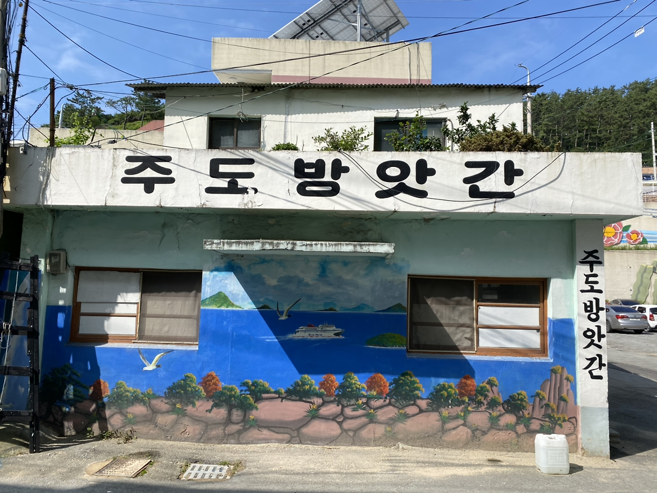 게하 뒷편 주차장으로 가는 길에 어제 봤던 주도방앗간을 다른 각도에서 보니 벽에 벽화가 그려져 있었다. 어제 봤던 한쪽 면은 밋밋했었는데 이날 본 다른 면은 칼러풀한 벽화에 파란 하늘, 내려쬐는 햇볕 덕에 더 멋지게 다가왔다. 바닷가 마을 감성이 물씬.