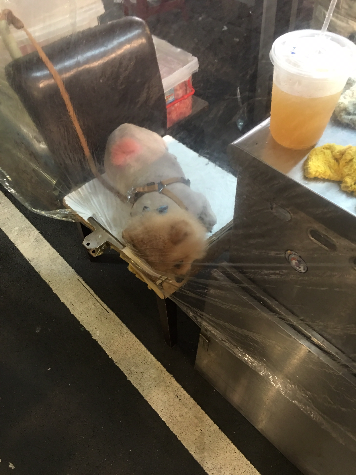 이 강아지는 주인 장사하는데 지쳤는지 비닐에 기대어 축 늘어져 있네요...