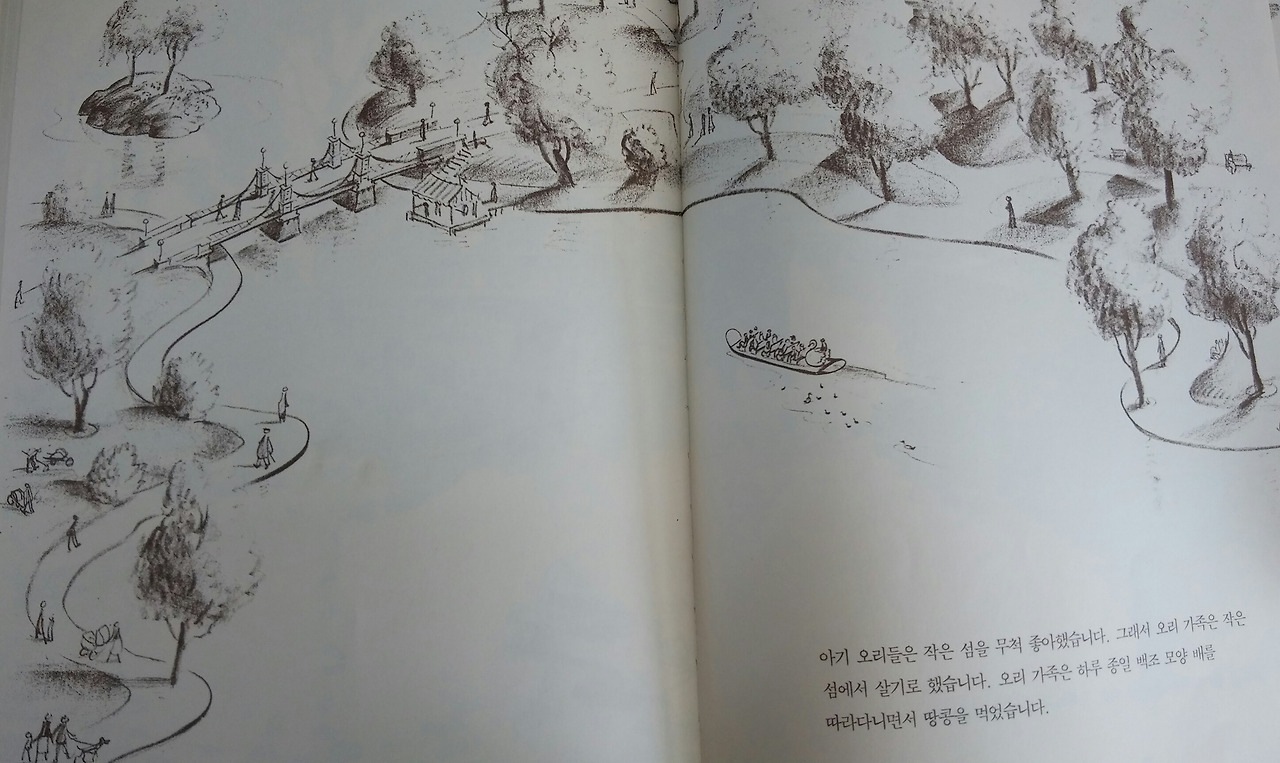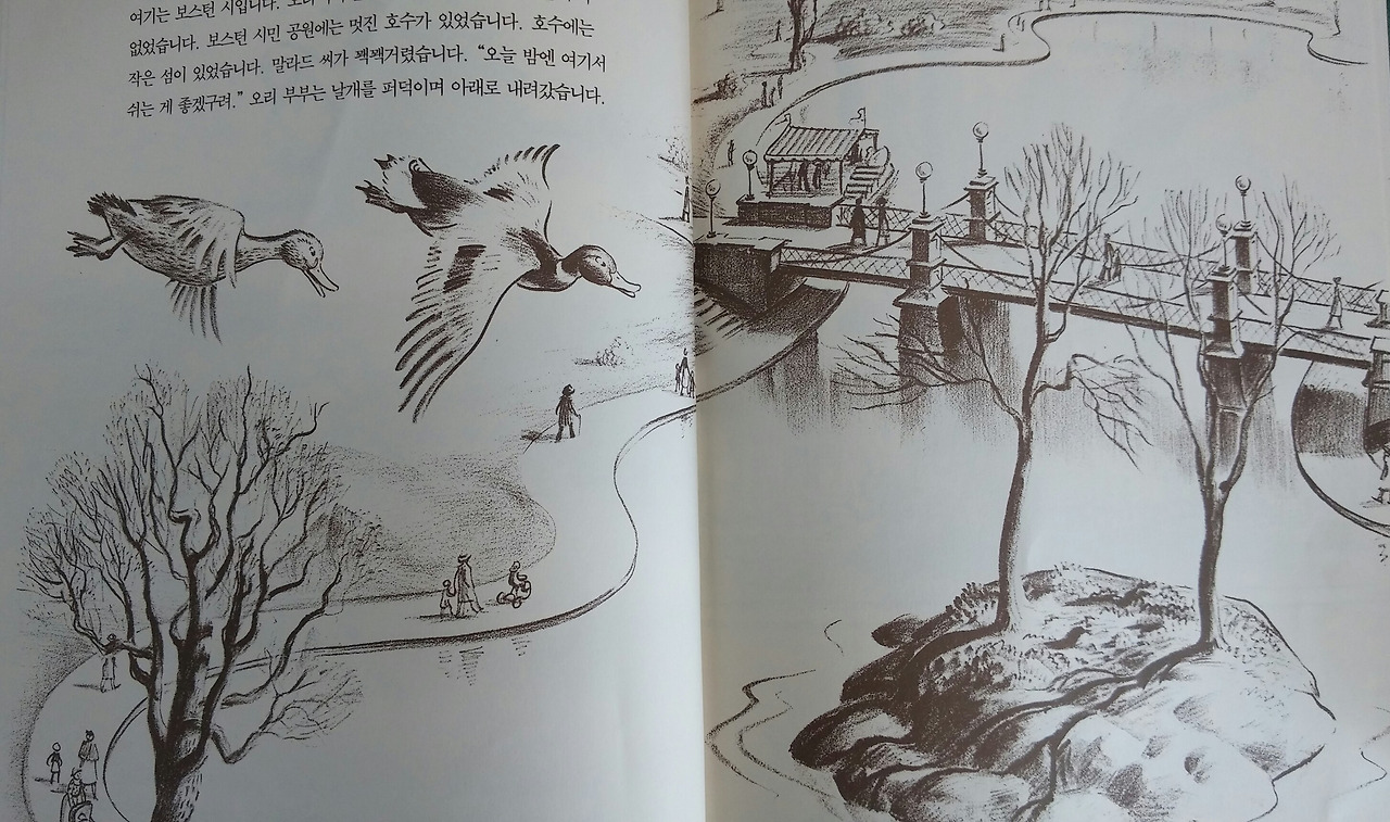 실제로 보스턴 시민공원에는 나란히 줄을 서서 걷는 엄마오리와 아기오리들의 동상이 있다고 한다. 이 그림책에서 나를 가장 매혹시킨 장면인 아기오리들이 줄을 서서 위험을 피하고, 엄마오리가 새끼들을 지키기 위해 꽥꽥 길을 비켜 달라 외치며 큰 길을 건너는 모습이 진짜 존재할 것만 같다. 보스턴을 직접 가보진 않았지만, 그림책에 등장하는 곳곳이 보스턴의 모습을 그대로 담고 있다하니 그곳에 살고 있는 사람에게는 이 그림책이 더욱 특별하게 느껴질 것이다.