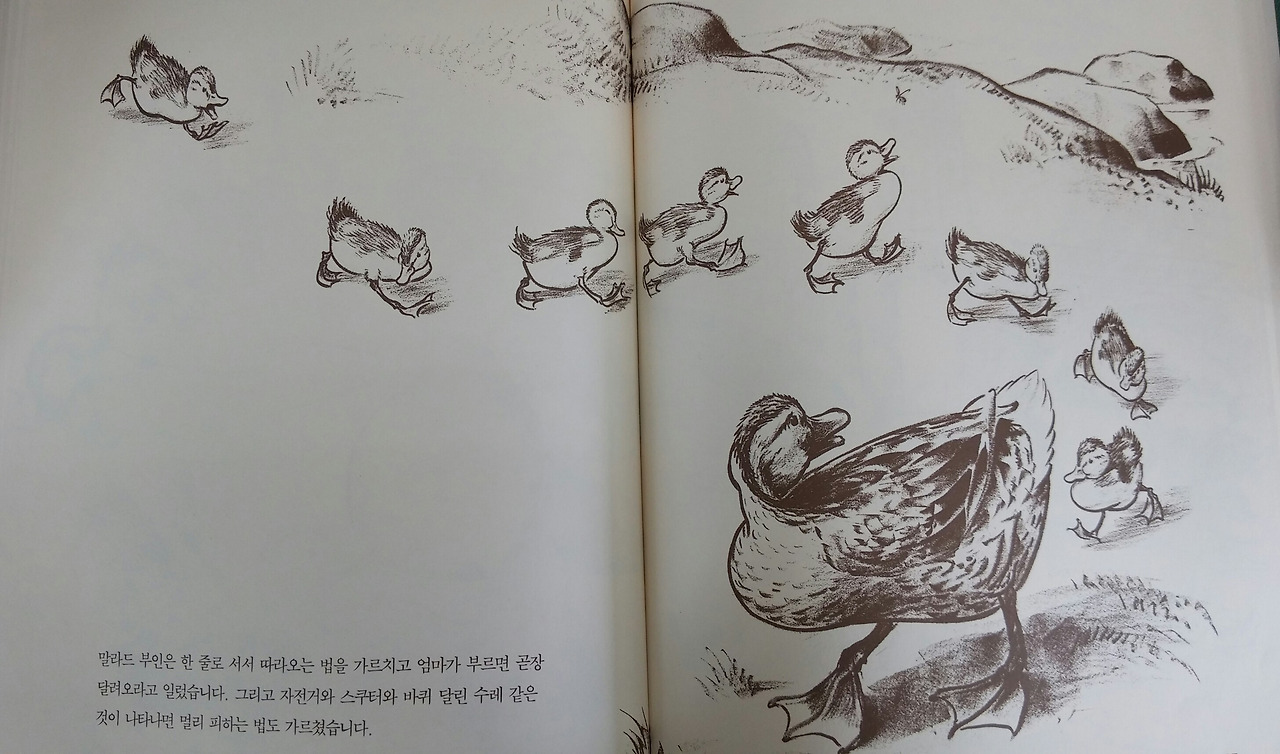 이 책의 Mallard씨 오리 부부는 둥지를 틀고 알을 낳을 수 있는 안전한 곳을 찾아 이 곳 저 곳을 찾아다닌다. 그러나 아빠 오리 Mallard씨가 찾아낸 곳마다 엄마 오리 Mallard부인은 마음에 들지 않는다. 숲 속엔 천적인 여우가, 물 속엔 거북이 살고 있어서, 어떤 곳은 먹을거리가 없어서, 천적인 여우나 거북이는 없지만 난폭한 자전거가 위협하기 때문이다. 둥지를 틀 곳을 찾아 헤메는 오리 부부가 나와 같았다.