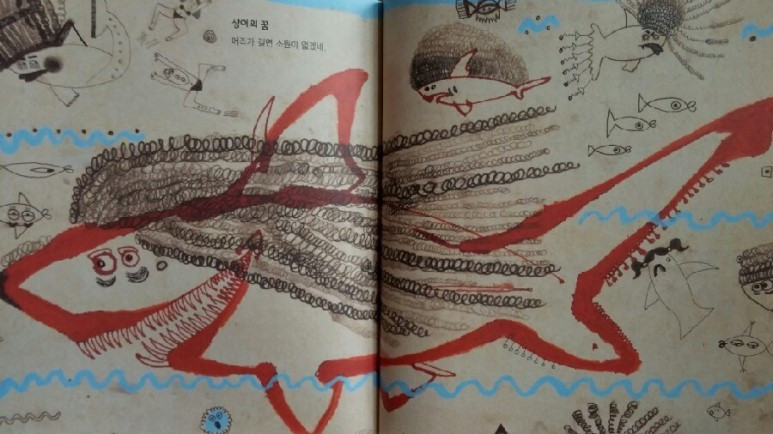 「무슨 꿈이든 괜찮아」는 “꿈은 참 좋은 거야. 누구든 꿀 수 있어.”라는 말로 첫 장을 시작한다. 역시 또 그저 그런 꿈에 대한 강요나 예찬인가 했는데, 이게 웬걸. 그 어디에도 ‘무엇이 되는 것’에 대한 이야기가 없다. 그저 소소한 각자의 소망을 소개하는 것이 전부다. 엄마 황새의 꿈은 오늘 하루 늘어지게 쉬는 것이다. 뱀장어 가족의 꿈은 에베레스트 산에 오르는 것이고, 꼬마 불의 꿈은 소방관 아저씨들과 놀기이다. 하루살이는 ‘딱 하루만 더 살았으면..’을 꿈꾼다. 태양의 꿈은 선글라스!! 누워서 한 번만 자고 싶은 굴뚝이나 날개가 두 개만 더 있었으면 하는 숨 가쁜 벌새의 꿈도 있고, 머리가 길면 소원이 없겠다는 웃기는 상어도 있다. 심지어 촌충은 “꿈? 난 그런 거 잘 몰라.”라고 말한다.