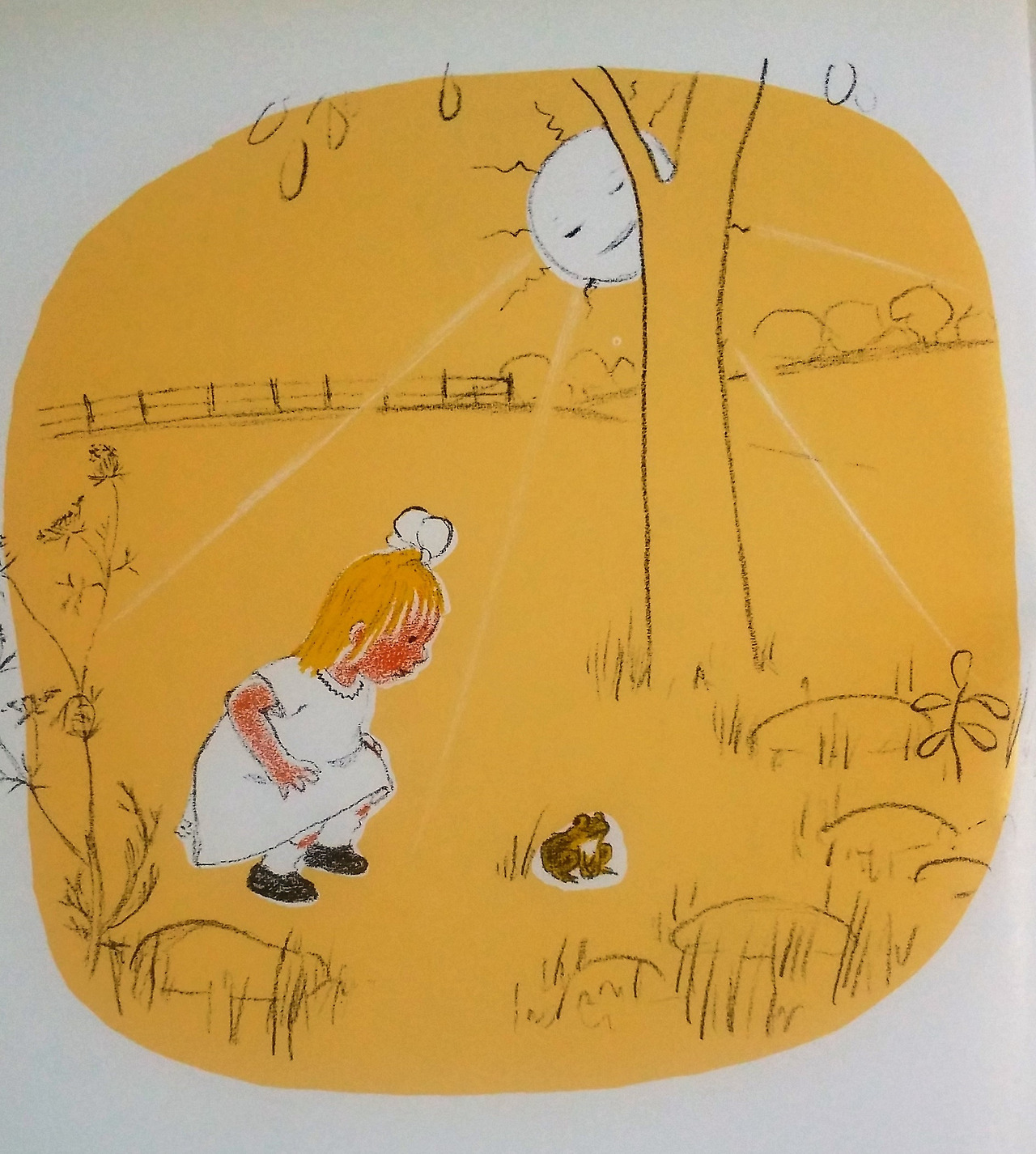 마리 홀 에츠의 「나랑 같이 놀자」도 그렇다. 해가 뜨자 들판으로 놀러 나가는 꼬마 여자아이. 들풀 이파리에 붙어 있는 메뚜기를 한 마리 만난다. "메뚜기야, 나하고 놀자."하고 다가가지만 메뚜기는 금세 달아나버린다. 연못가의 개구리도, 거북이도, 떡갈나무 아래의 다람쥐와 토끼도, 나뭇가지 위의 어치도, 그리고 풀밭에 나타난 뱀까지도 "나하고 놀자."하며 다가가는 꼬마 여자아이로부터 달아난다. 같이 놀아줄 친구들이 없어 슬퍼진 여자아이가 가만히 바위에 앉는다. 그러자 달아났던 동물 친구들이 하나씩 곁으로 돌아온다. 이번에는 숨을 죽이고 가만히 지켜보자 동물들도 더 이상 겁먹고 곁을 떠나지 않는다. 아기 사슴까지 나타나 여자 아이에게 다가가 뺨을 핥아준다. 행복감에 가득 찬 아이가 환하게 웃는다.