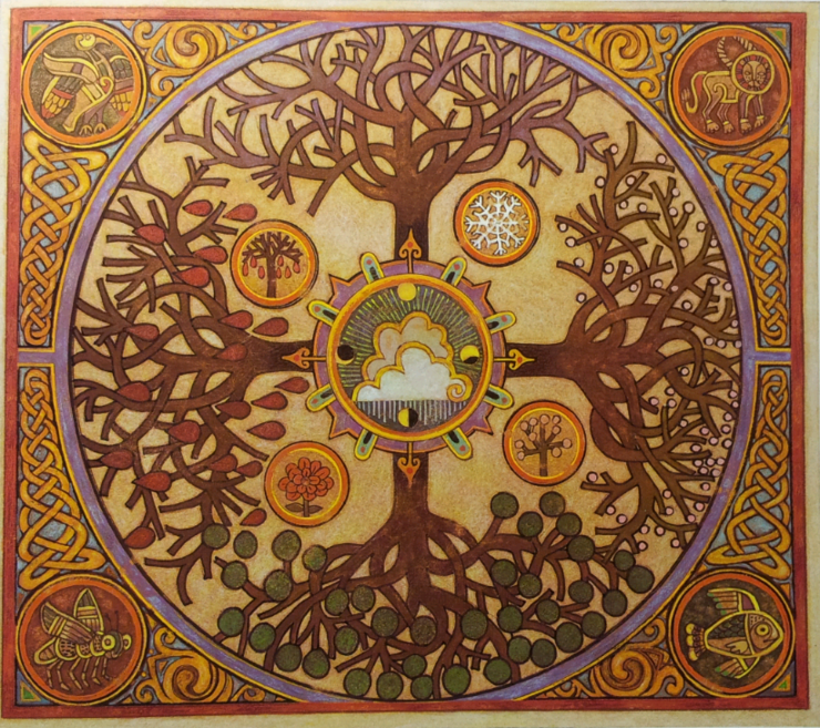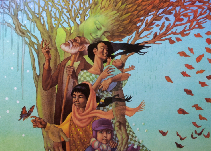 나무 한 그루가 갓난 아이부터 노인까지 인간의 생을 감싸고 있다. 그리고 나무 역시 움트는 새싹에서 무성한 나뭇잎과 지는 낙엽, 그리고 앙상한 가지의 모습을 모두 담고 있다. 변화하는 나무의 계절과 인간의 생 모두 그 시작과 끝이 어디인지 알 수 없다. 인간의 생은 나무로 표현되는 자연과 마찬가지로 '때의 이치'가 있다는 의미로 읽힌다. 그리고 생명을 가진 모든 것은 나름의 리듬에 따라 움직인다는 '때'의 의미를 아이가 자라는 모습을 보면서 이제야 조금이나마 알 것 같다.