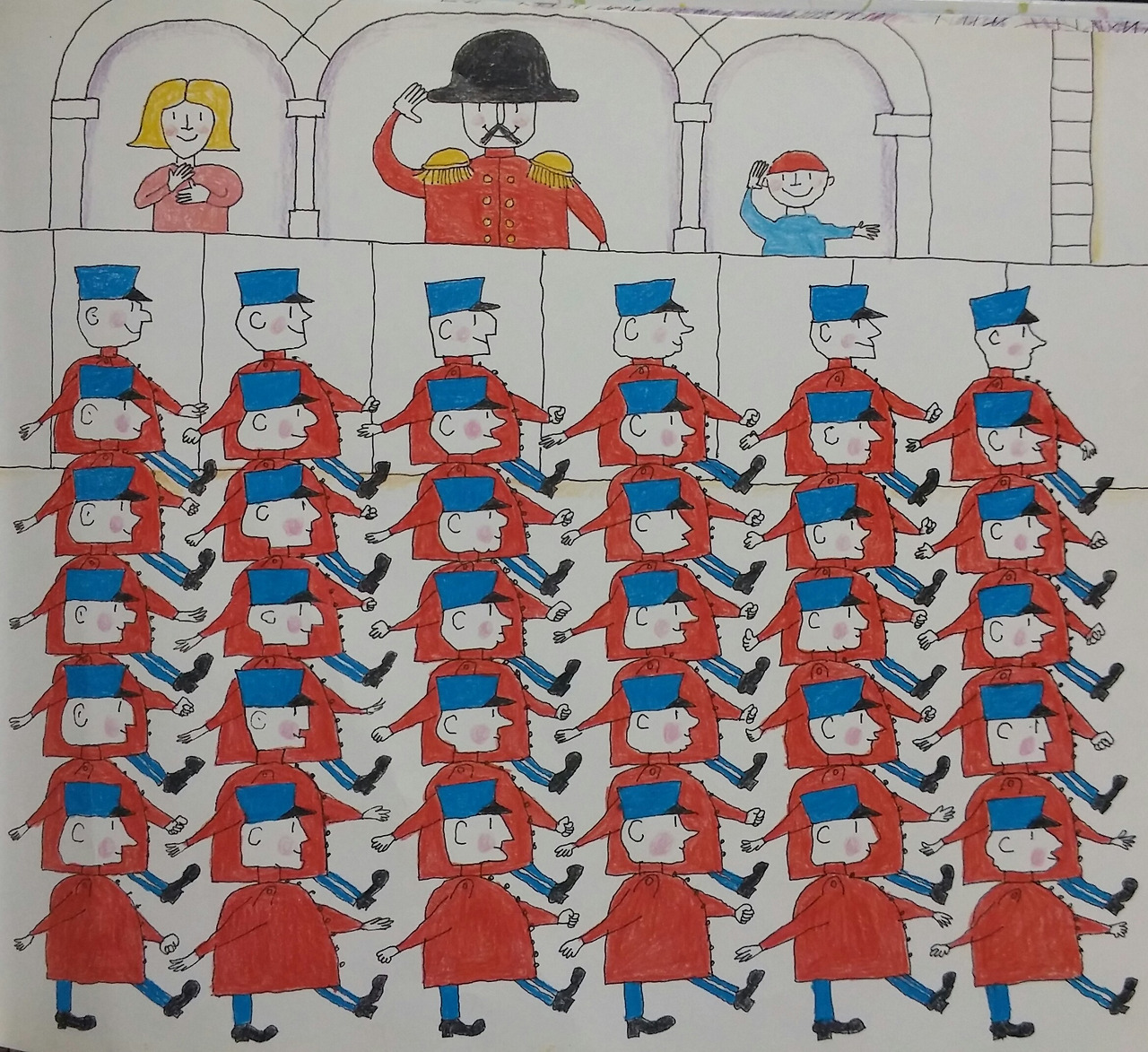 전쟁이라는 소재를 다루지만, 마치 애들이 그린 것 마냥 삐뚤빼뚤해 보이는 단순한 선과 가벼운 색연필 채색이 주는 느낌이 친숙하고 유쾌하다. 아이들은 그림책 곳곳에 나타나는 익살에 깔깔 웃기도 하면서 이야기에 빠져들었다. 그림책을 다 읽어주고 난 후에 재미있었던 부분, 기억에 남는 장면, 생각이나 느낌에 대해 자유롭게 대화를 나누고 다시 질문을 던졌다.