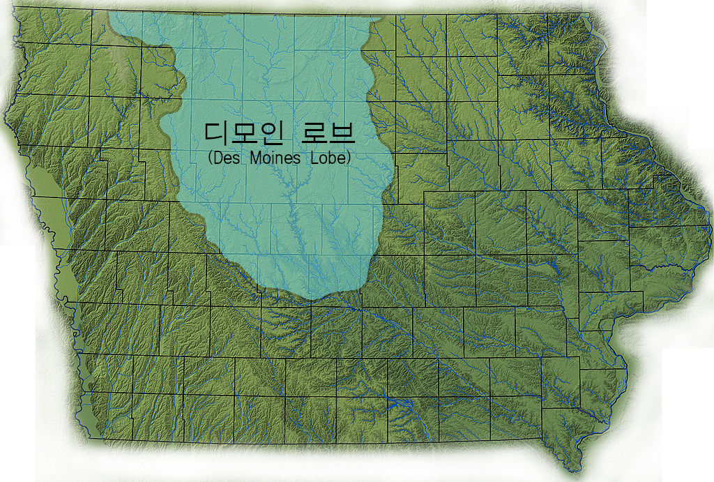 차를 타고 달리면 선뜻 와닿지 않을 수도 있지만, 자전거를 타고 아이오와를 달려 보면 디모인 근처나 그보다 북쪽의 지형, 즉 디모인 로브 지역은 정말 지루할 정도로 평평하고, 아이오와의 나머지 지역은 크고 작은 언덕들이 계속 이어지는 지형이라는 것을 실감할 수 있다. 지평선 끝까지 언덕도 없고 계곡도 없고 그저 옥수수밭만 보이는 곳이 디모인 로브 지역이다.