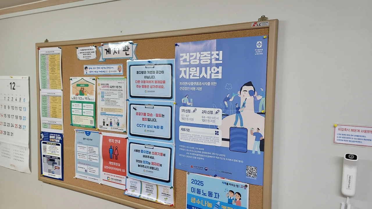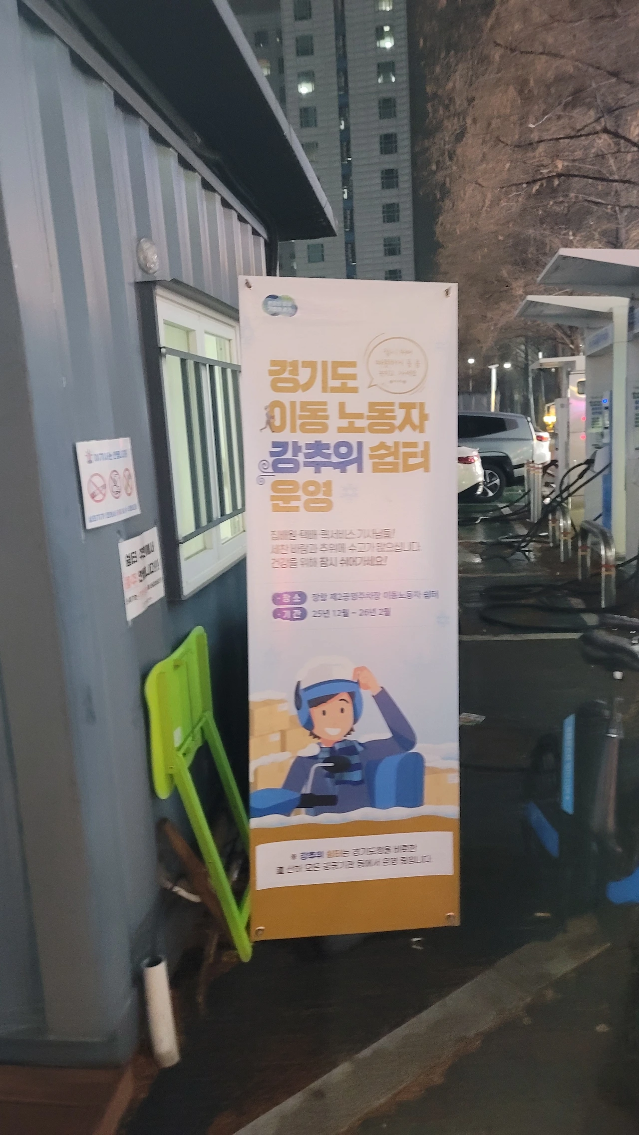 차를 세워두고 쉼터에 들어서자 온기가 느껴졌다. 따뜻한 물을 한 잔 받아 들고 의자에 앉았다. 게시판에는 여전히 이동노동자를 위한 정보들이 붙어 있었고 대리운전 기사님들이 콜을 기다리며 조용히 담소를 나누고 있었다. 그 모습이 유난히 반가웠다. 나도 다음 콜이 잡히기 전까지 몸과 마음에 온기를 채웠다.