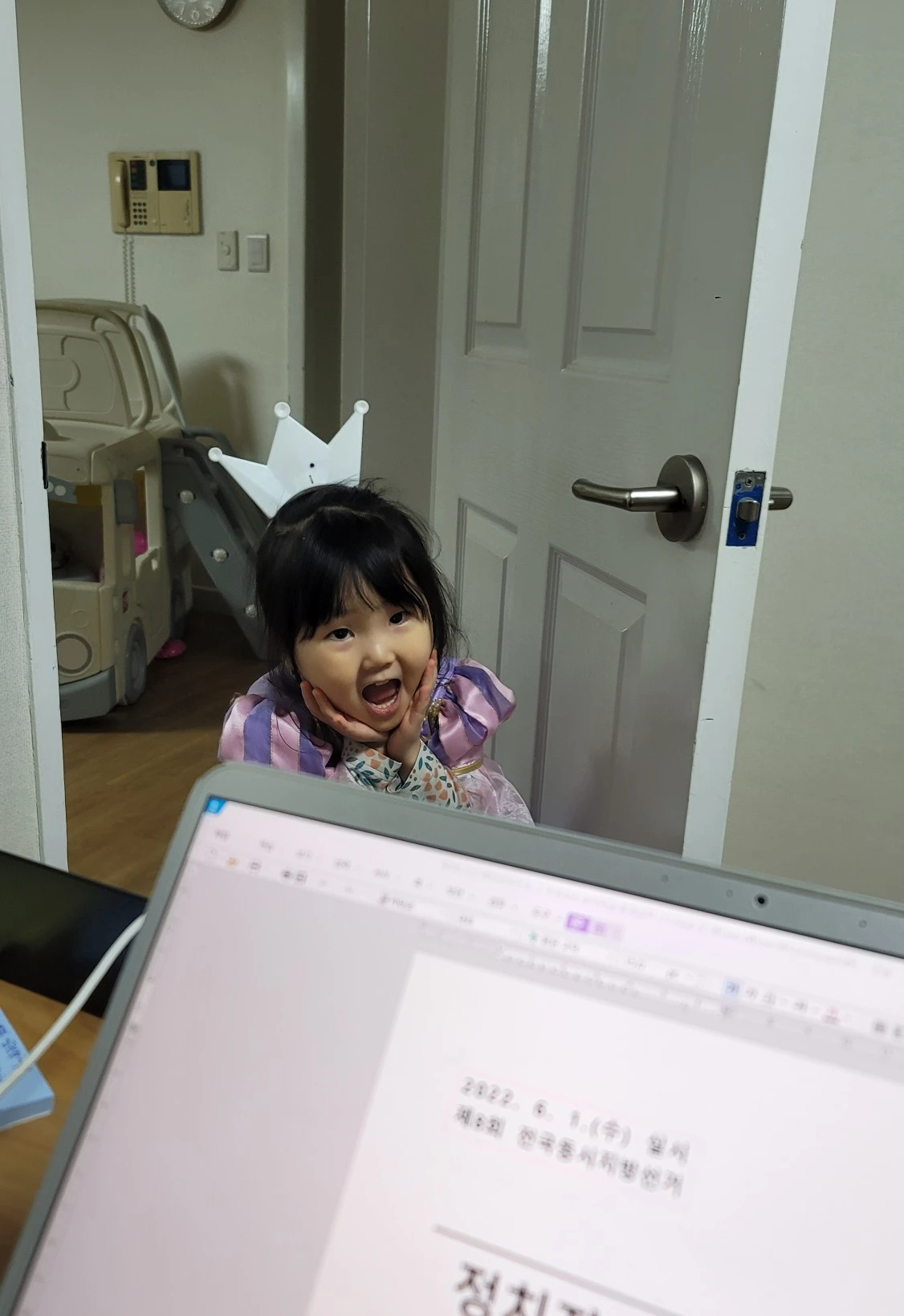 서재문을 수시로 열고 들어와 시크릿쥬쥬 옷을 입었다며 나타나 화려한 패션쇼를 선보이는 빛나라, 그리고 아빠 일을 돕겠다며 노트북 앞에 마우스를 쟁취하곤 '적극적인 방해'를 시작한 새로이.