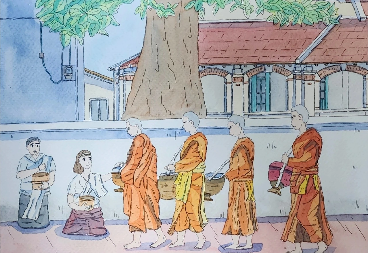 시간이 얼마나 흘렀을까? 창문 밖에는 여명이 펼쳐졌다. 주섬주섬 옷을 입고 밖으로 나왔다. '탁발(불교에서 수행법 중 하나로, 집마다 돌아다니며 먹을 것을 구하는 행위)'을 보기 위해서였다. 이미 길가에는 공양물을 준비한 사람들로 긴 줄이 펼쳐졌다. 동이 조금씩 트기 시작하면서 100m 멀리 주황빛, 선홍빛의 승려들이 대나무 바구니를 들고 걸어온다. 신도들은 무릎을 꿇은 채 자신들이 준비한 것들을 공양한다. 어느 집은 밥을, 어느 집은 생선을, 어느 집은 야채와 과일을... 승려들은 성심을 다해 공양물을 바구니에 넣는다. 이렇게 받은 먹을거리들은 하나도 남김없이 나누어 먹는다고 한다. 공양물 하나하나가 간절한 소망과 정성이 담겨 있기 때문이다다. 신도들은 합장하고 스님들은 온화한 미소로 답한다. 이보다 더 순수하고 경건한 아침이 있을까?