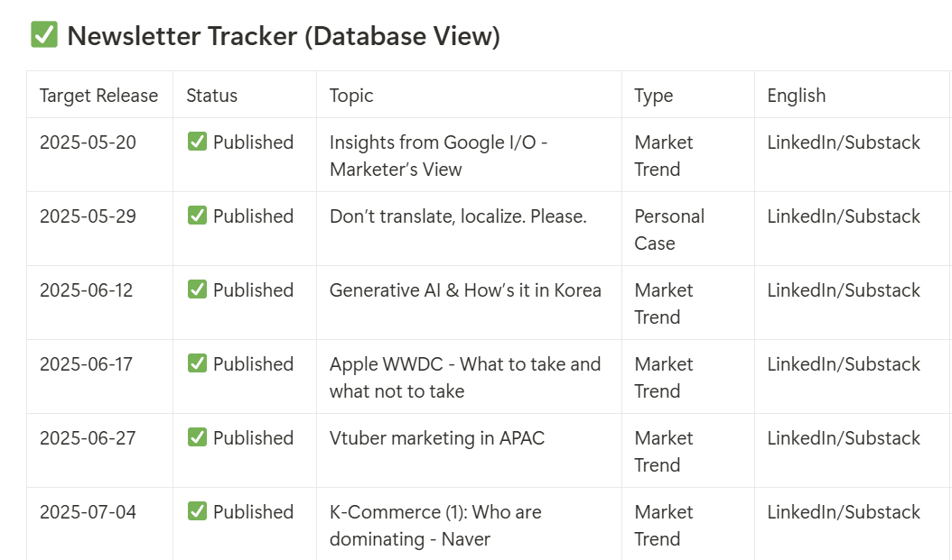 지금까지 쓴 글들은 이런 식으로 노션에 트래커를 만들어서 정리하고 있는데, 아이디어가 생겼을 때 적어놓기도 좋고 쌓아가는게 눈에 보여서 나름의 성취감도 든다.
