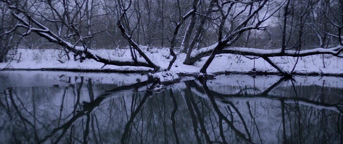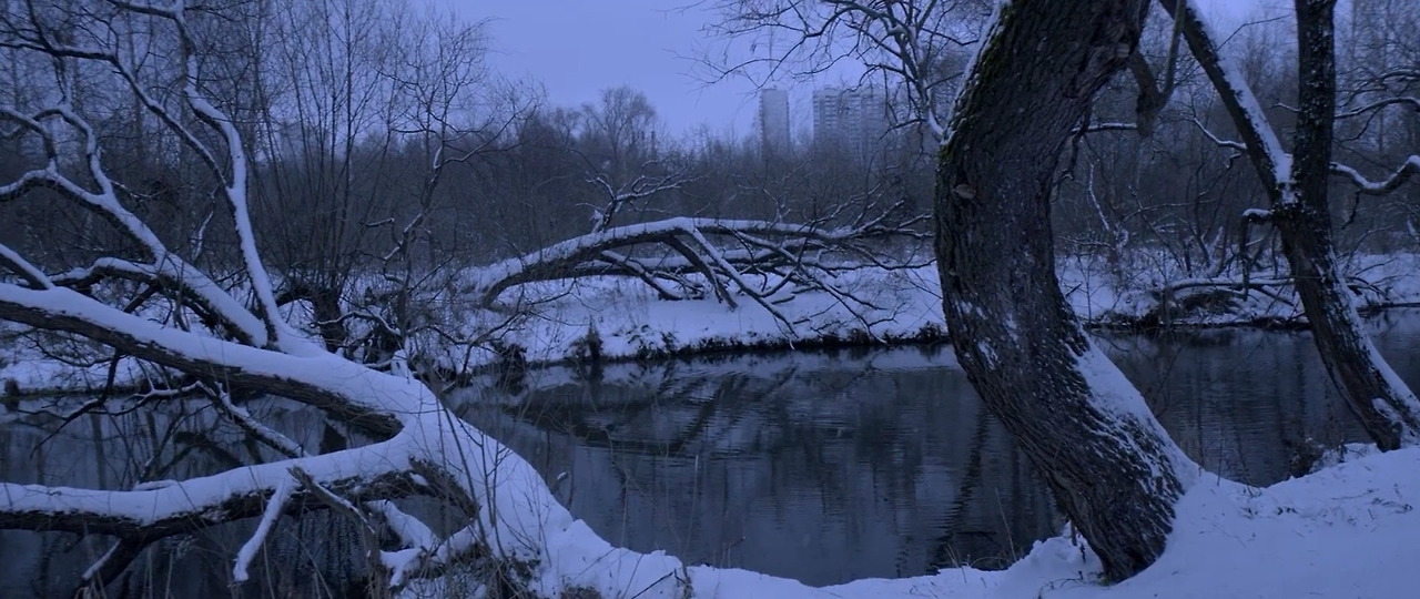 <러브리스>는 다양한 방식으로 허무함을 전달합니다. 인공조명을 쓰지 않아 어둡고 음울한 화면을 조성하고, 죽음과 자살의 테마를 반복하고, 불모의 계절인 겨울을 활용해 메마름과 황폐함을 드러냅니다. 현실적인 각본을 통해서 인물의 무너진 내면을 효과적으로 드러내기도 합니다. 수미상관으로 사용된 영화 앞뒤의 틸팅(Tilting)과 알로샤의 시점 쇼트를 통해 허무하고 쓸쓸한 마음을 극대화하기도 하죠.