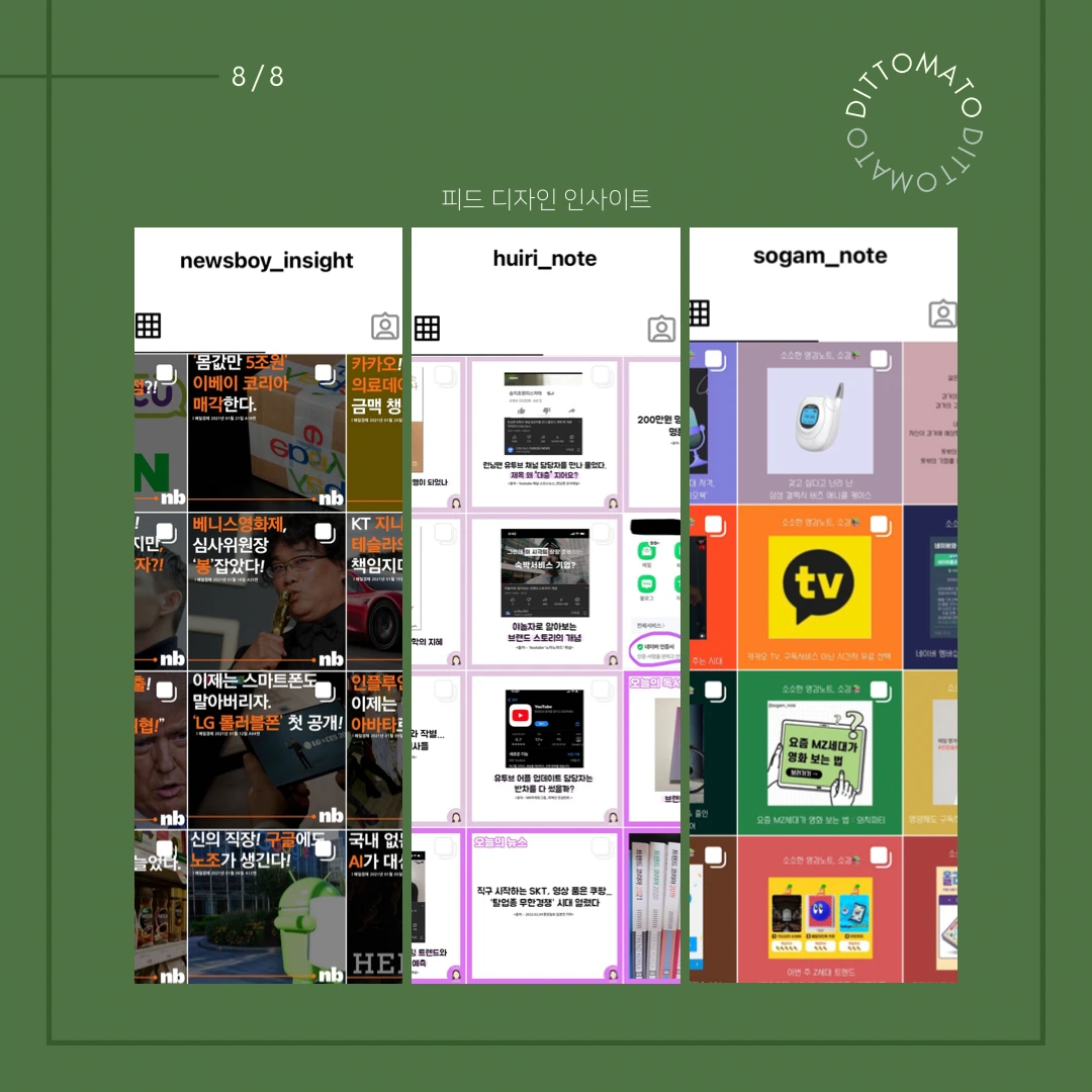 어제 남편이 이제 슬슬 피드 디자인을 만들어보지 않겠냐는 말을 꺼냈다. 제목도 첫 장에 크게 나타내면 내 피드에서 글을 쉽게 찾아볼 수 있을 것 같다고 했다. 수많은 사람들의 업로드 속에서 쉽게 눈에 띄지 않아 보기 힘들 것 같다는 피드백에, 나만의 아이덴티티를 나타내 줄 템플릿 디자인을 만들어야겠다고 생각했다. 앞서 말했듯 기여도가 많고 너무 몰입해버리면 쉽게 지칠 수 있기 때문에 적당한 선에서 시도해보려 한다.