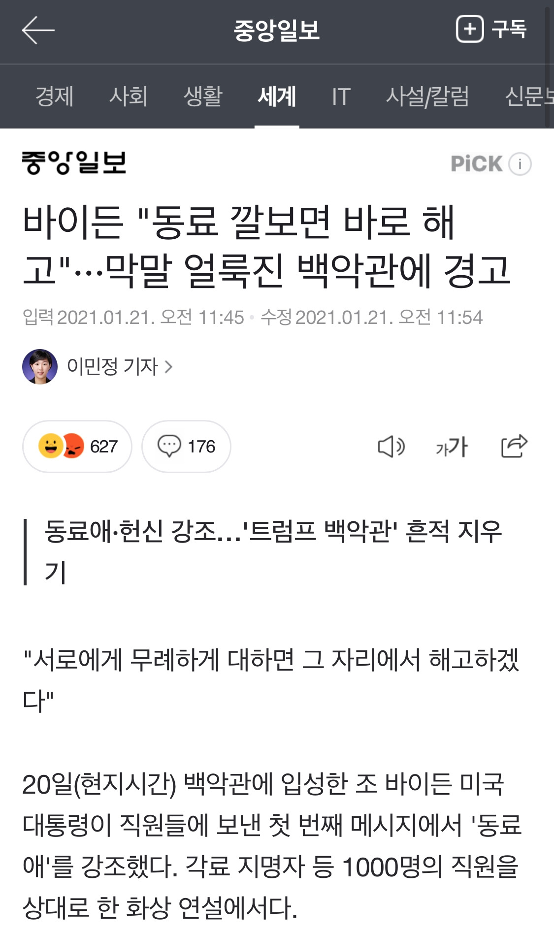 제46대 미국 대통령 바이든 대통령은 백악관에 입성한 후 1000명의 관료들 상대로 화상 연설을 하는 자리에서 ‘상호 존중’을 강조했다. 무례하거나 깔보는 행위에 가만히 있지 않겠다며 그 자리에서 해고하겠다는 엄중한 경고를 했다.