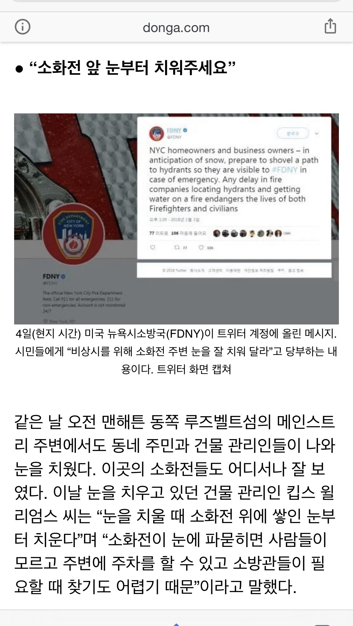 자유가 강조되는 나라에서 이렇게 사람들이 눈에 민감하게 대처하는 이유는 제도의 뒷받침 덕분이라고 생각한다. 뉴욕시 제설법엔 눈이 멈춘 시간 기준 4시간 안에 눈을 치워야 하고 만약 저녁에 눈이 그쳤다면 14시간 안에 치워야 한다고 나온다. 신속한 제설작업을 하지 않으면 과태료가 부과되고, 그 보다도 더 무서운 건 제설을 제대로 하지 않았다가 지나가던 행인이 넘어져 심하게 다치기라도 하면 엄청난 손해배상을 각오해야 한다.