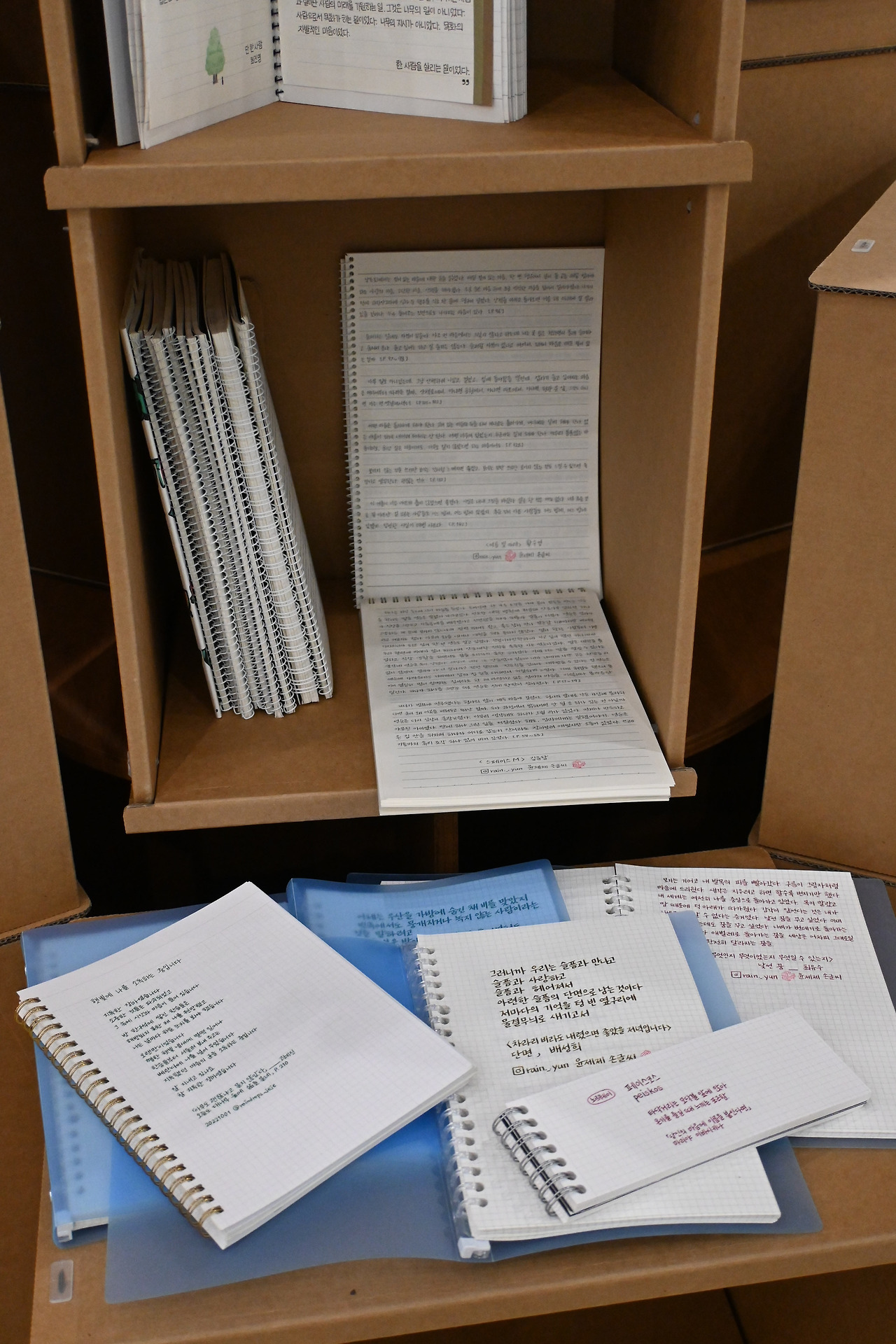 페어가 끝나고 셀러로서의 짐과 기록수집가로서의 짐을 챙겼다. 포토카드가 생각보다 많이 팔려서 그것은 가벼워졌는데, 나의 필사 노트들은...... . 무거운 마음으로 필사노트를 챙기러 전시 공간으로 갔다. 노트들을 챙기는데 스태프분이 다가오셔서 말씀하셨다. "어떻게 이렇게 써요? 사진 많이 찍어가셨어요." 순식간에 빨개진 얼굴로 "가.. 감사합니다." 하고는 멋쩍게 웃어 보였다. 자, 이제 양손 가득 무겁게 챙긴 짐을 가지고 다시 일상으로 돌아갈 시간이다.