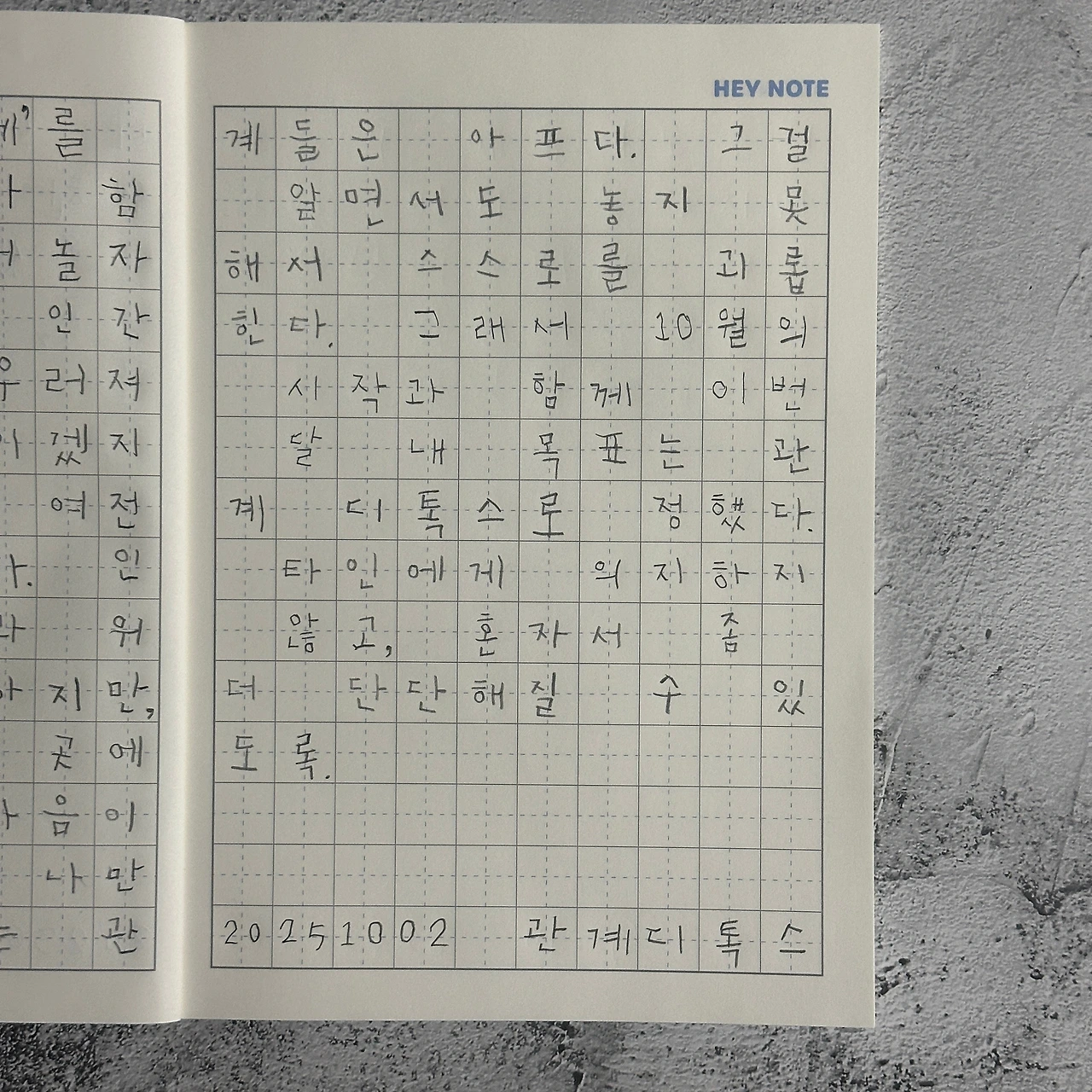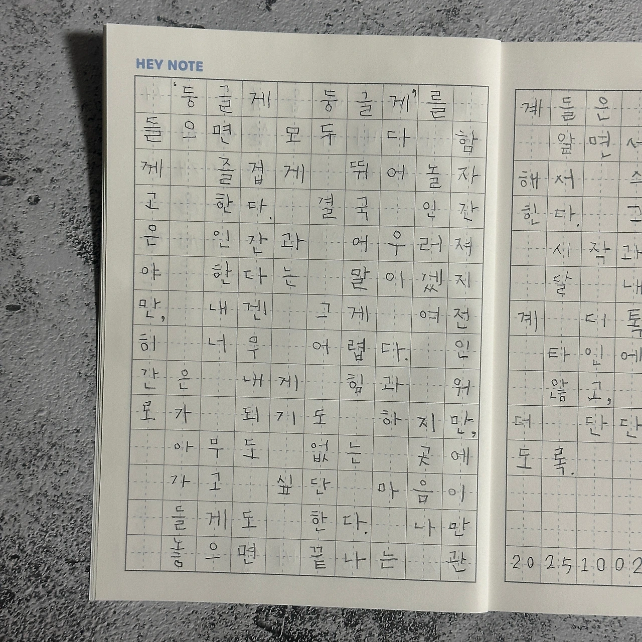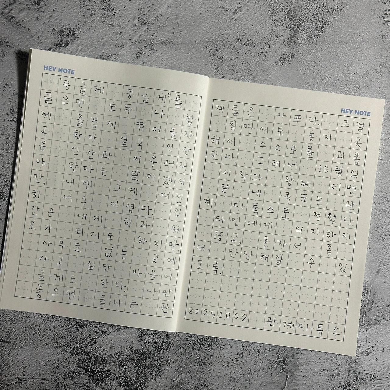 ‘둥글게 둥글게’를 들으면 모두 다 함께 즐겁게 뛰어놀자고 한다. 결국 인간은 인간과 어우러져야 한다는 말이겠지만, 내겐 그게 여전히 너무 어렵다. 인간은 내게 힘과 위로가 되기도 하지만, 아무도 없는 곳에 가고 싶단 마음이 들게도 한다. 나만 놓으면 끝나는 관계들은 아프다. 그걸 알면서도 놓지 못해서 스스로를 괴롭힌다. 그래서 10월의 시작과 함께 이번 달 내 목표는 관계 디톡스로 정했다. 타인에게 의지하지 않고, 혼자서 좀 더 단단해질 수 있도록.
