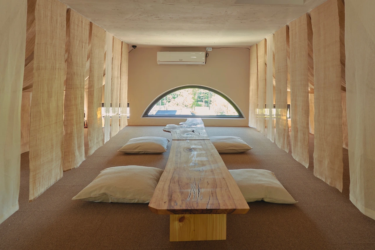 콘크리트 돔이었던 이곳에 자연의 물성 가득한 삼베와 녹나무 테이블을 두니 비로소 이곳의 쓰임이 떠올랐습니다. 마음과 몸이 지친 사람들을 위로하는 휴식처가 되어주자고.