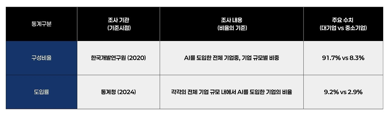 2020년 당시만 보면 한국 대기업은 이미 AI 선두주자처럼 보였다. AI를 도입한 기업 중 91.7%가 대기업이었으니 말이다. 그러나 이는 착시였다.