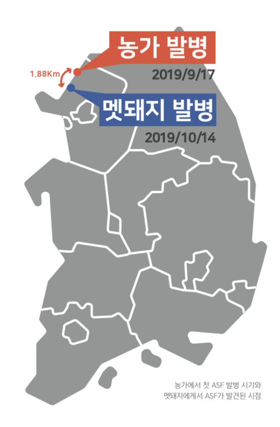 한국은 지난 9월 17일 파주시 연다산동 돼지 농장에서 ASF가 처음 발병하였다. 그 이후 연천, 김포, 강화, 철원 등지의 농가와 멧돼지에서 발생하였으며 현재까지 돼지농장 약 14곳, 멧돼지 약 30마리에서 발병이 확인되었다. 그런데 한국에서 ASF가 발생한 지역을 보면 강화, 김포 및 철원 지역을 제외하고 ASF 발병농가와 ASF 발병 멧돼지 발견 지점이 매우 인접해 있는 곳이 많다. 그러나 중요한 건 모두 먼저 농가 발생하고 약 2주에서 1달 이후에 인근 멧돼지에서 발병했다는 점이다. 농가와 멧돼지의 발병지역이 서로 3-4㎞ 이내의 근거리에서 발생한 경우(ASF 차단을 위해 울타리를 설치 할 때 감염지역은 1.3㎞, 위험지역은 3㎞로 설정하고 있음)만 추려 분석하면 모두 농가에서 먼저 일어나고 나중에 멧돼지에서 발생하는 패턴이다(표 참조). 즉, 멧돼지에 의한 전파보다 오히려 집돼지에서 멧돼지에게로 옮겨갔을 가능성을 시사하는 대목이라 할 수 있다.