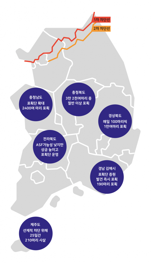 이에 반해 한국은 ASF가 발병하고 멧돼지에서도 발병이 확진되자 삽시간에 전국이 멧돼지 사냥터로 돌변했다. 발병지역은 물론 경계지역에서도 멧돼지의 신속한 전면제거를 목표로 야생 멧돼지 개체수 조절을 발표한 15일 이후 2988마리를 잡았고, 10월 15일에서 11월 10일까지 전국적으로 총 14,754마리를 잡았다. 발병지역은 물론 본 사태와 전혀 무관한 충청도, 전라도, 경상도 그리고 심지어는 제주도에서도 포획은 이루어졌다. 경상북도는 올해 14,000마리 이상을 포획하여 발생지역을 제외한 지자체에서는 가장 많았다. 충청북도는 9,500마리 이상을 잡았는데 일부 이중 70%를 자가소비를 하는 것으로 나타났다. ASF 대응과 무관한 멧돼지 사냥임을 보여주는 대목이다. 경기도와 강원도를 제외한 이남 지역에서 포획된 멧돼지에서는 ASF 바이러스가 전혀 검출되지 않았다. 마치 멧돼지를 합법적으로 죽일 기회만을 기다렸다는 양, 지자체마다 멧돼지를 솎아내는데 혈안이 되어있는 것이다.