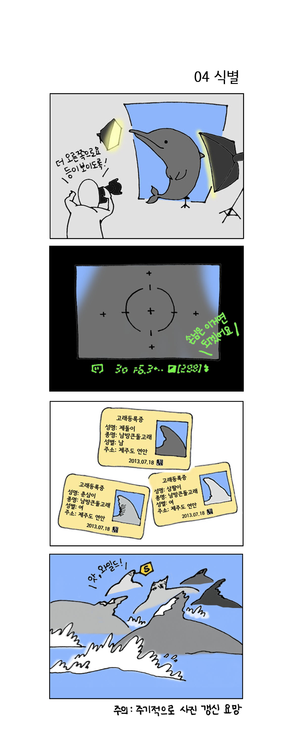 두 번째 만화의 암호 같은 글자들은 우리가 돌고래의 행동을 관찰할 때 사용하는 용어들입니다. 일반적으로 각 개체의 이름을 제일 앞에 적고, 행동을 재빨리 기록하기 위해 약어를 사용합니다. ‘SFR’는 수면 위에 둥둥 떠서 휴식을 취하고 있는 행동을 의미합니다. ‘JMP’와 ‘B’는 각각 뛰어오르기(jump)와 호흡(breath)의 약자입니다. ‘SP(D, S, BDO) w/ S&C’는 풀어쓰면 swimming in pair (deep, straight, bellydown)으로, 제돌이가 삼팔이·춘삼이와 함께 나란히 대형을 이루어 물 속에서 배를 아래로 하여 직선방향으로 곧게 나아가는 것을 의미합니다.
