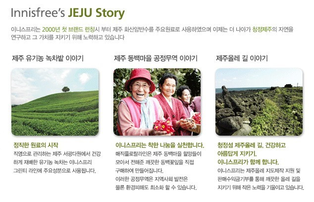 이니스프리는 2009년 깨끗한 자연과 건강한 아름다움이 공존하는 청정섬 제주라는 이야기를 바탕으로 브랜드 컨셉을 재정립했습니다. 그리고 제주에서 채취할 수 있는 천연원료를 제품 컨셉에 접목했습니다. 2009년 500억이었던 연 매출은 2016년 1조 원을 돌파했고 이니스프리는 글로벌 브랜드로 성장했습니다. 자연주의 화장품 중 하나였던 이니스프리가 '청정섬 제주'라는 이야기를 찾아 가장 강력한 자연주의 화장품이 되었습니다.