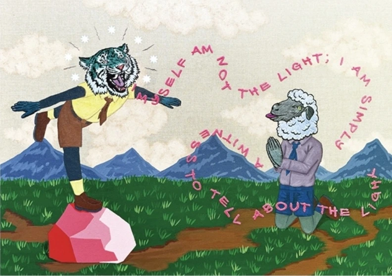 재미있는 그림이다. 코이치로 타카기의 그림에는 바위 위에서 한발로 중심 잡는 호랑이의 머리를 한 넥타이 맨 반인반수가 있다. 그 옆으로 붉은 혀를 내밀고 두 손을 모아 합장하는 자세로 무릎 꿇고 있는 양 머리의 반인반수가 있다. 크림색 하늘에 하얀 구름이 있는 하늘 아래 다섯 봉우리의 산새들이 나란히 보인다. 발아래로 보이는 잡초들과 풀 사이로 보이는 흙길이 무얼 말하는 걸까.