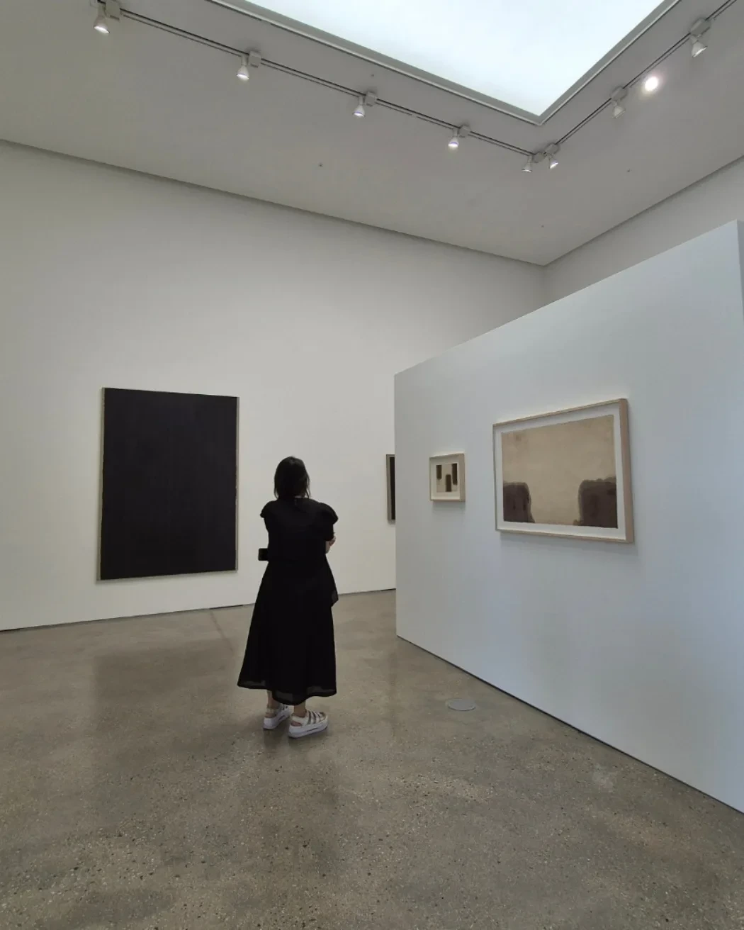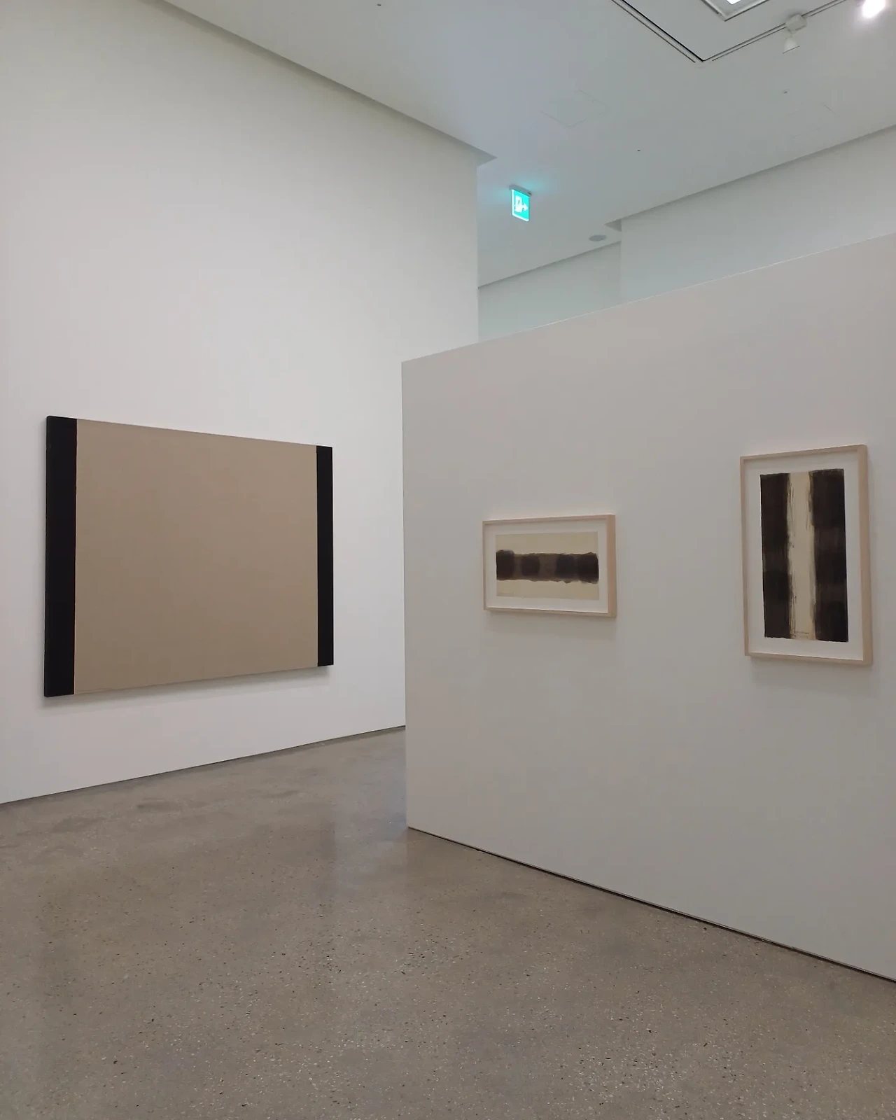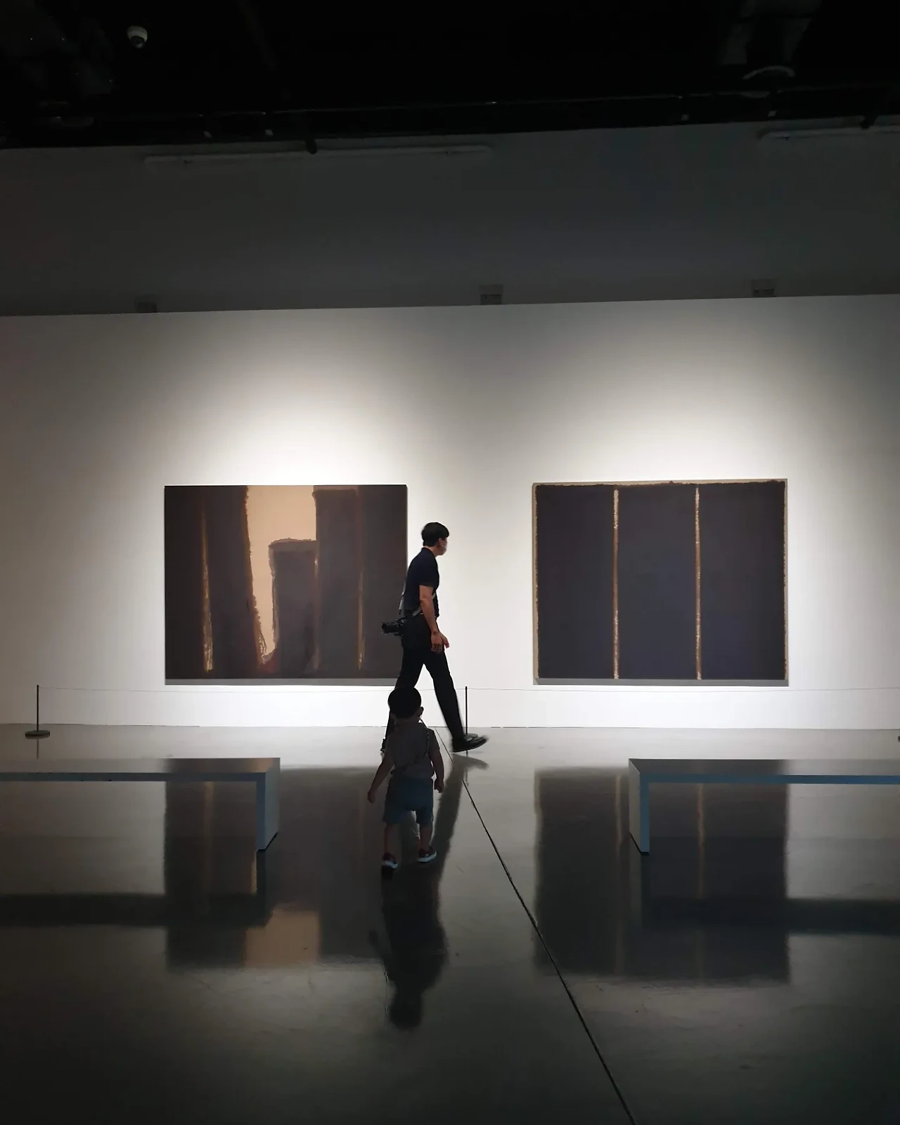 나는 그날 윤형근 작품을 만났다. 그날 기록에는 서울을 그리워하며 국립중앙박물관 같은 전시를 세번 보러 가던 나의 20대가 있었다. 전시회가 거의 없던 섬에서 생활을 갑갑해하는 기록이 가득했다. 할 수 없이 등지고 무시하려 두었던 미술관행은 나에게 큰 고통을 주었다. 코로나. 신생아 육아…. 마스크를 쓰고 떨리는 마음으로 어둑어둑한 날씨에 들어간 현대미술관에서 나는 윤형근 작품을 만났다. 아들과 나는 서로 앉아 그림을 보며 한참 시간을 보냈는데 내 마음을 모를 리 없는 남편은 사진을 남겨주었다. 첫 번째 사진이 마음에 무척 들었고 한동안 내 프로필 사진이 돼주었다. 3년 전 그때의 나에게 걱정하지 말라고 곧 너는 만나게 될 거라고 희망의 메시지를 인제야 보내본다. 윤형근 화백의 침묵과 고요는 나의 3년을 대변한다.