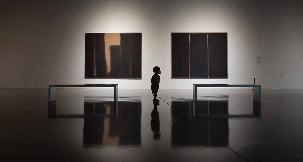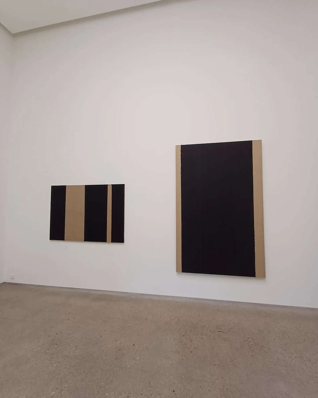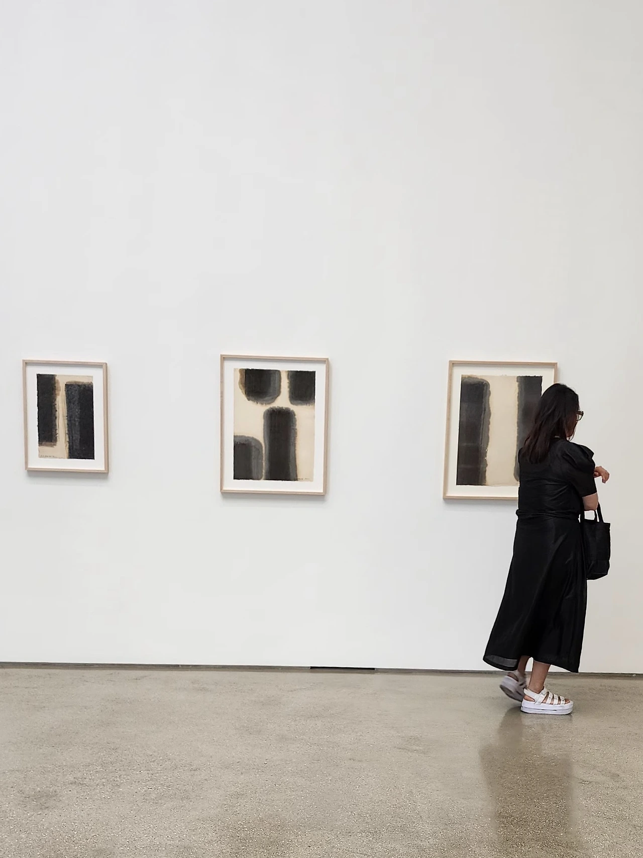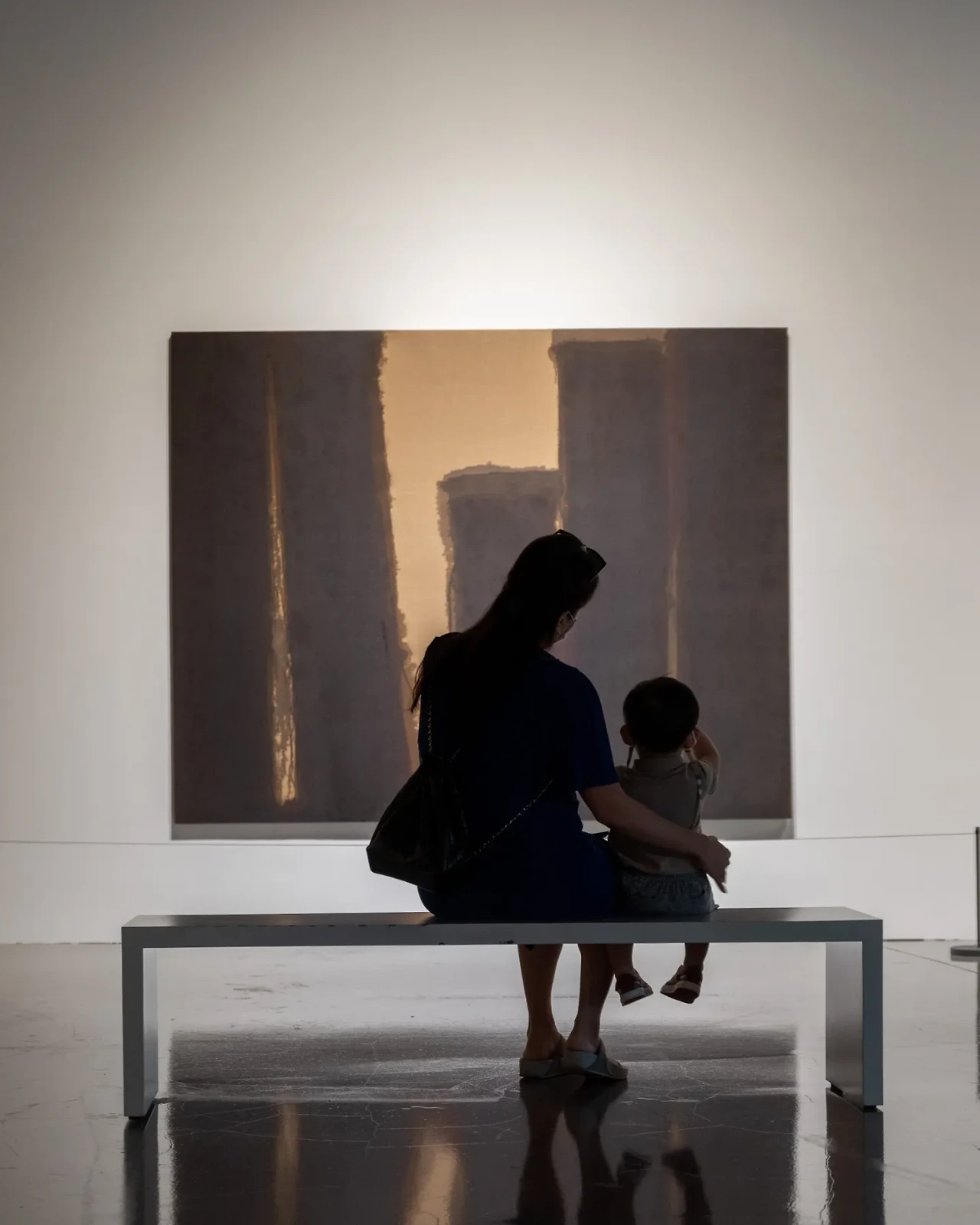 나는 그날 윤형근 작품을 만났다. 그날 기록에는 서울을 그리워하며 국립중앙박물관 같은 전시를 세번 보러 가던 나의 20대가 있었다. 전시회가 거의 없던 섬에서 생활을 갑갑해하는 기록이 가득했다. 할 수 없이 등지고 무시하려 두었던 미술관행은 나에게 큰 고통을 주었다. 코로나. 신생아 육아…. 마스크를 쓰고 떨리는 마음으로 어둑어둑한 날씨에 들어간 현대미술관에서 나는 윤형근 작품을 만났다. 아들과 나는 서로 앉아 그림을 보며 한참 시간을 보냈는데 내 마음을 모를 리 없는 남편은 사진을 남겨주었다. 첫 번째 사진이 마음에 무척 들었고 한동안 내 프로필 사진이 돼주었다. 3년 전 그때의 나에게 걱정하지 말라고 곧 너는 만나게 될 거라고 희망의 메시지를 인제야 보내본다. 윤형근 화백의 침묵과 고요는 나의 3년을 대변한다.