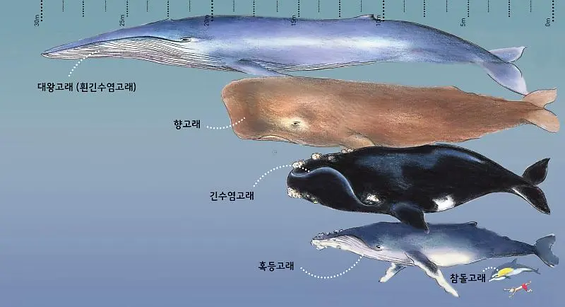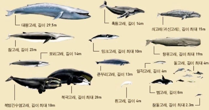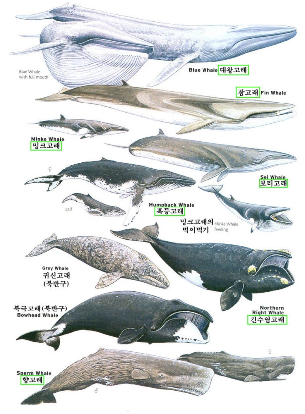 일각고래 Sea Unicorn 범고래 Killer Whale 북극고래 Bowhead Whale 긴수염고래 Northern Right Whale 대왕고래 Blue Whale 혹등고래 Humpback Whale 향유고래 Sperm Whale 귀신고래 Grey Whale 참고래 Fin Whale 보리고래 Sei Whale 밍크고래 Minke Whale