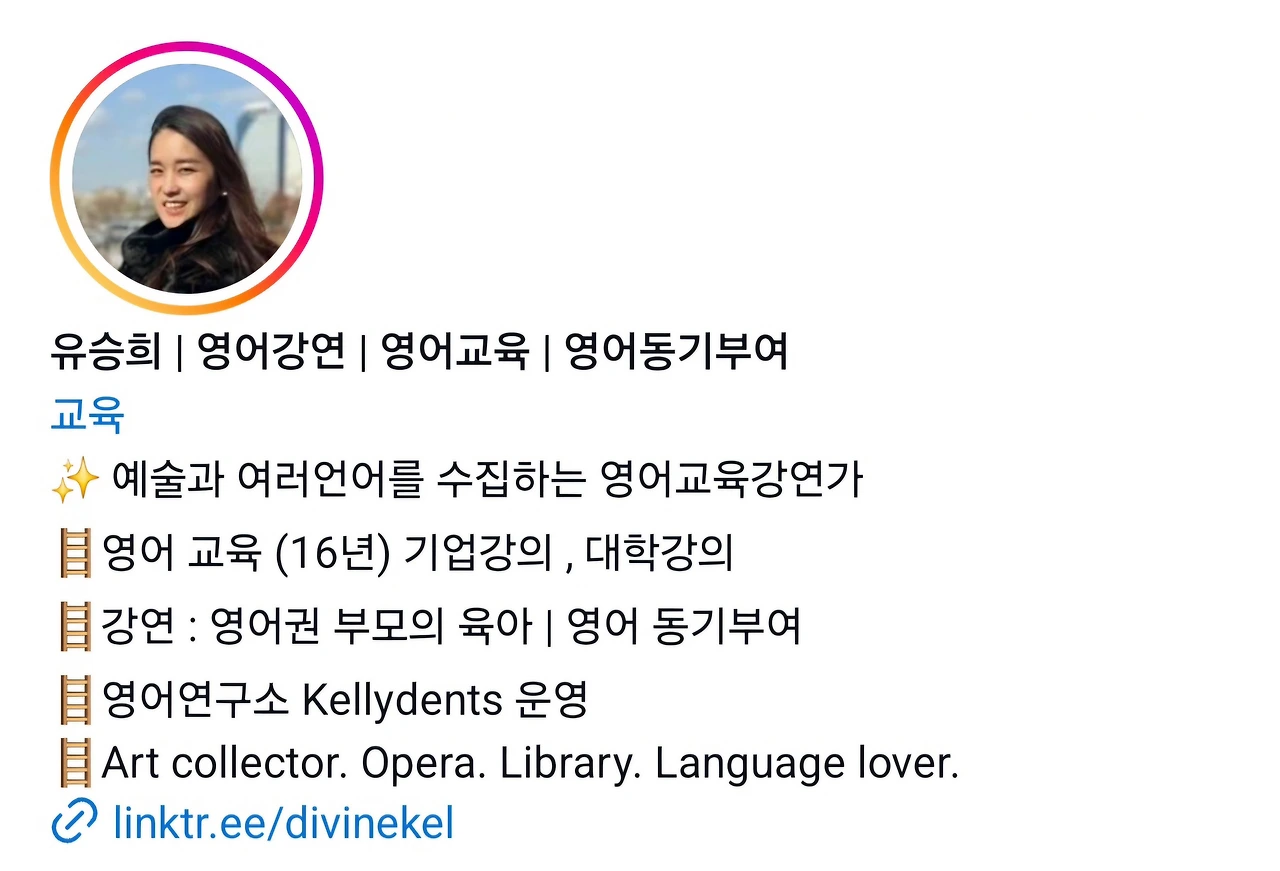예술을 사랑하고 그에 필요한 다양한 여러 언어를 공부해 나가고 있는 영어 교육 강연자입니다. 현재 영어 교육을 16년째 하고 있습니다.