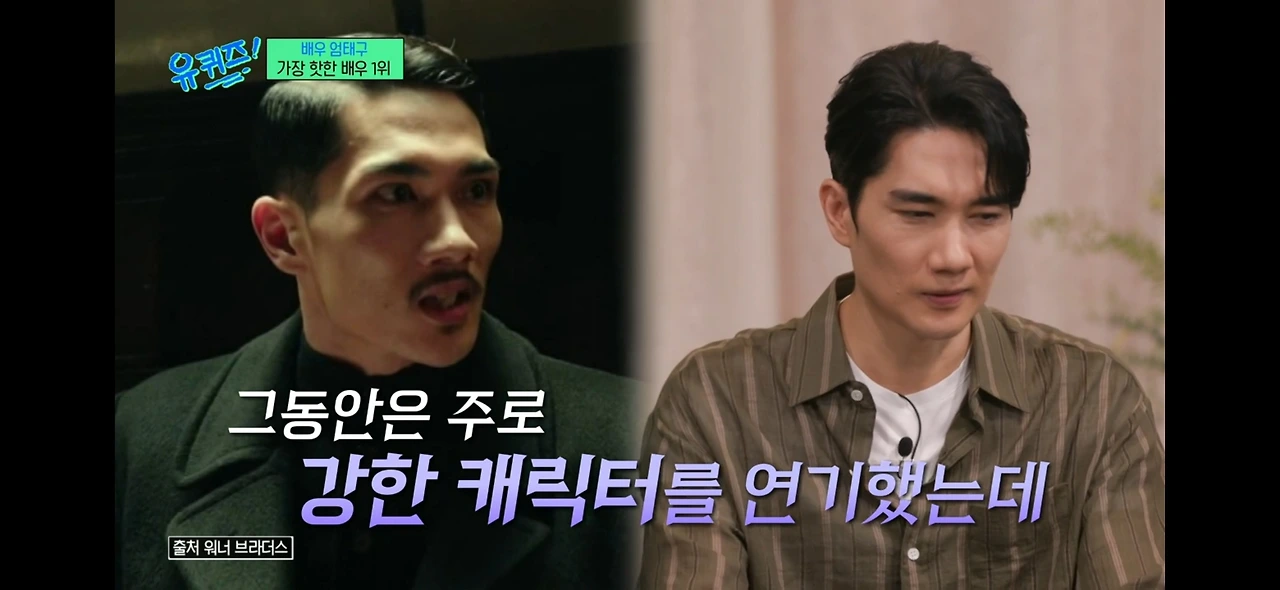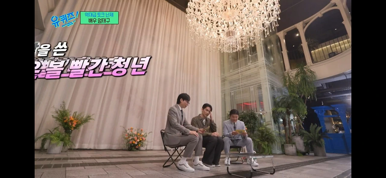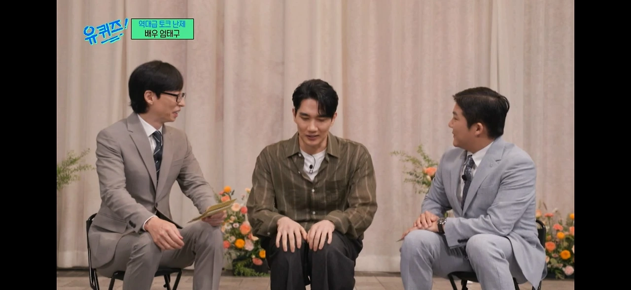 조용한 성향의 그가 배우가 된 그것조차가 대단해 보이는 사람이다. 목소리가 굉장히 허스키해서 눈길이 간 배우 엄태구. 이번 종영한 로맨스 코미디 드라마 <놀아주는 여자>에서 조폭 아들 연기를 보고 유퀴즈에서의 모습이 반전 그 자체다. 예능에서의 그는 <바퀴 달린 집> 이후로 두 번째이고, 손을 무릎에 두고 손에 난 땀을 닦는 것인지 자주 문지르는 모습이 재밌다.